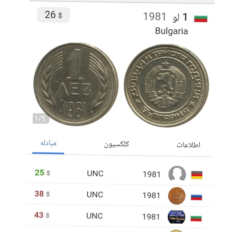 سکه 1 لوا بلغارستان ..البته در نگاه اول سکه پیش پا افتاده و ساده ایی بنظر میاد ، ولی این سال ضرب یعنی سال 1981 در بیشتر سکهای بلغارستان سال خاصی هست بخصوص این سکه که قیمت بالایی در سایتهای خارجی .یو کوین و.....دارد باکمی تحقیق متوجه خواهید شد.