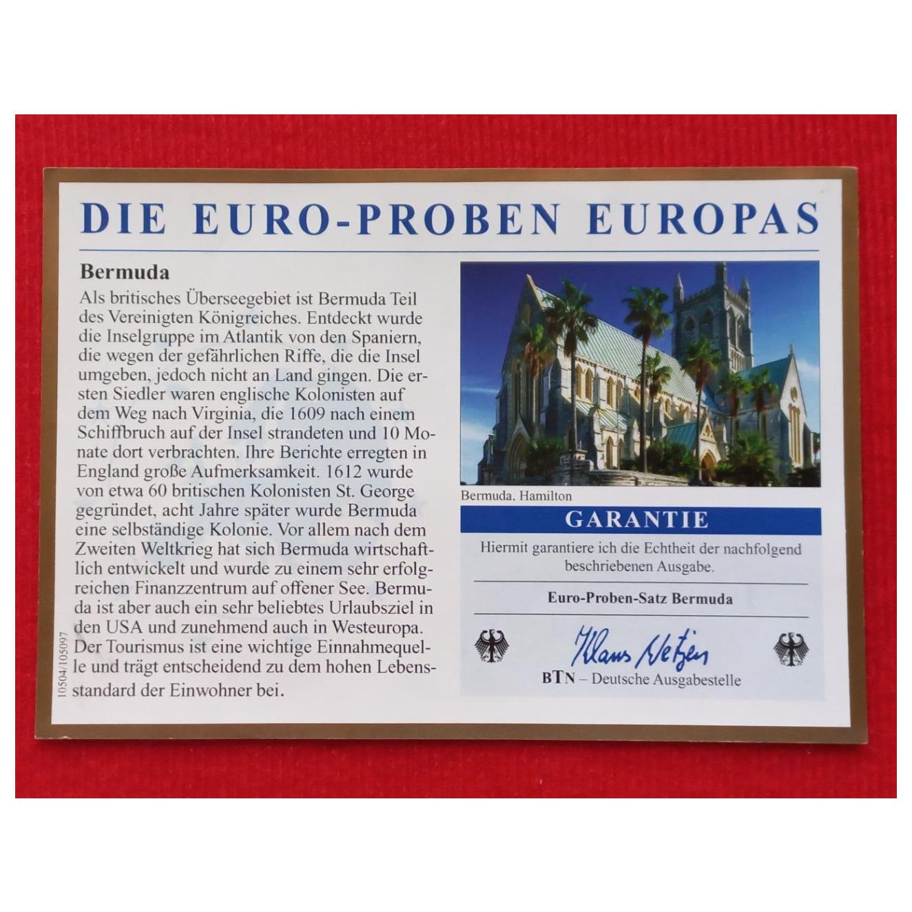 آیتم 14 - 287 _ پروف ست زیبای سکه های نمونه یورو برمودا 2012 از مجموعه نمونه های سکه یورو اروپا، ضمانت شده توسط دفتر صدور BTN آلمان،به همراه برگه ضمانت نامه و سرتیفیکیت،خاص و تکرار نشدنی قیمت 5 میلیون تومان.