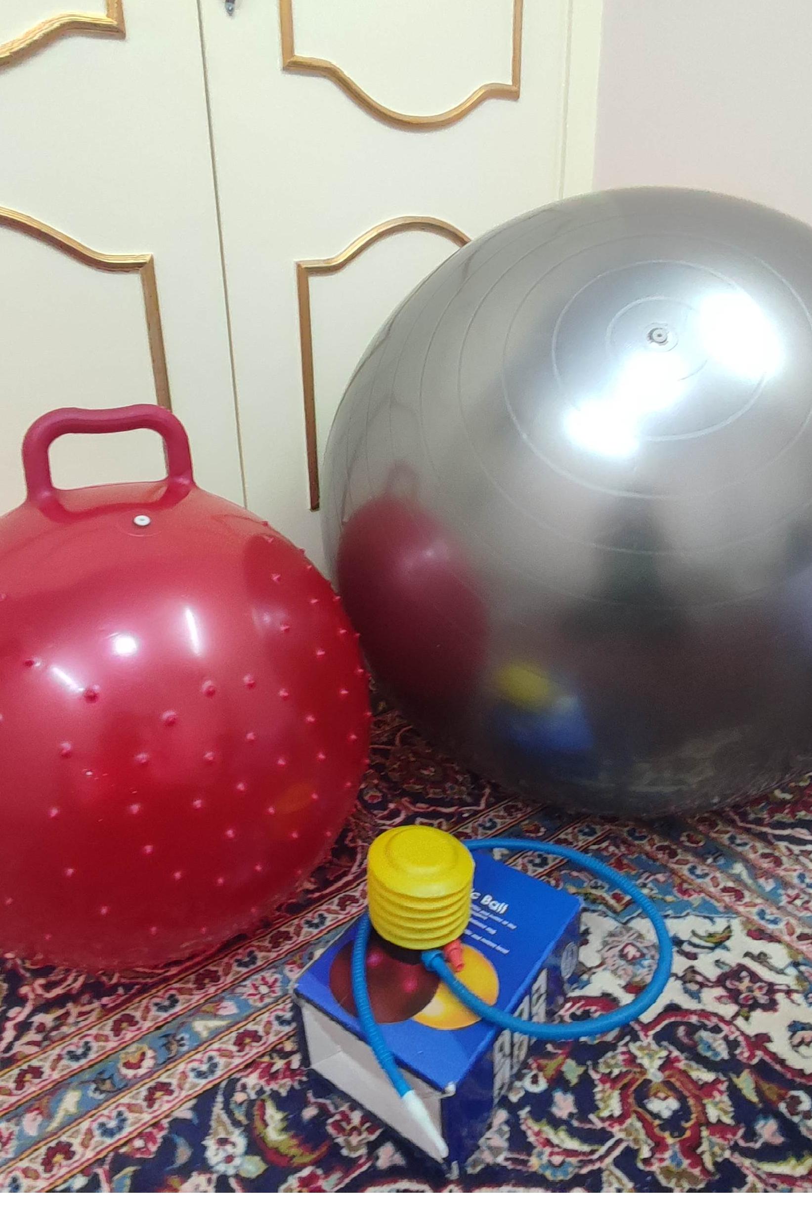توپ جیم بال سایز 85، رنگ نقره ای، به همراه تلمبه، در حد نو ( توپ کوچک برای مقایسه سایز هست و قابل فروش نیست )