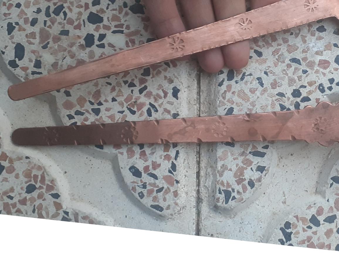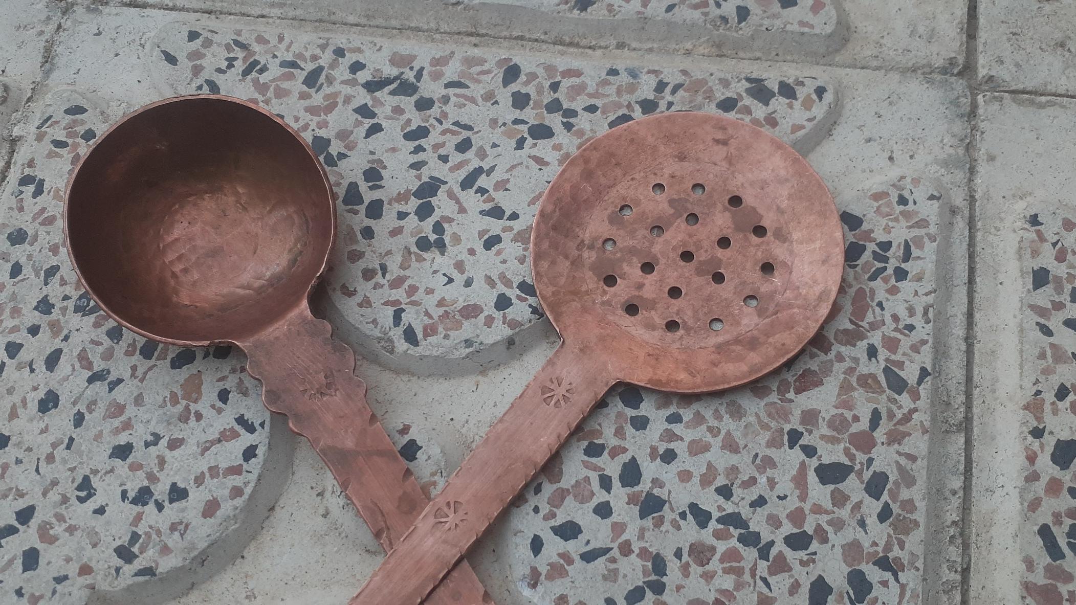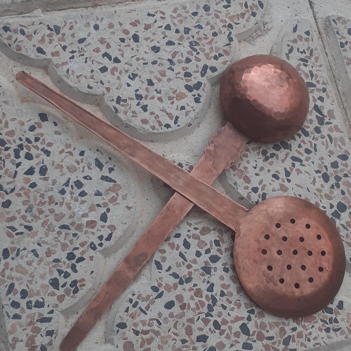 کفگیر و ملاغه مسی قدیمی توضیح دارد