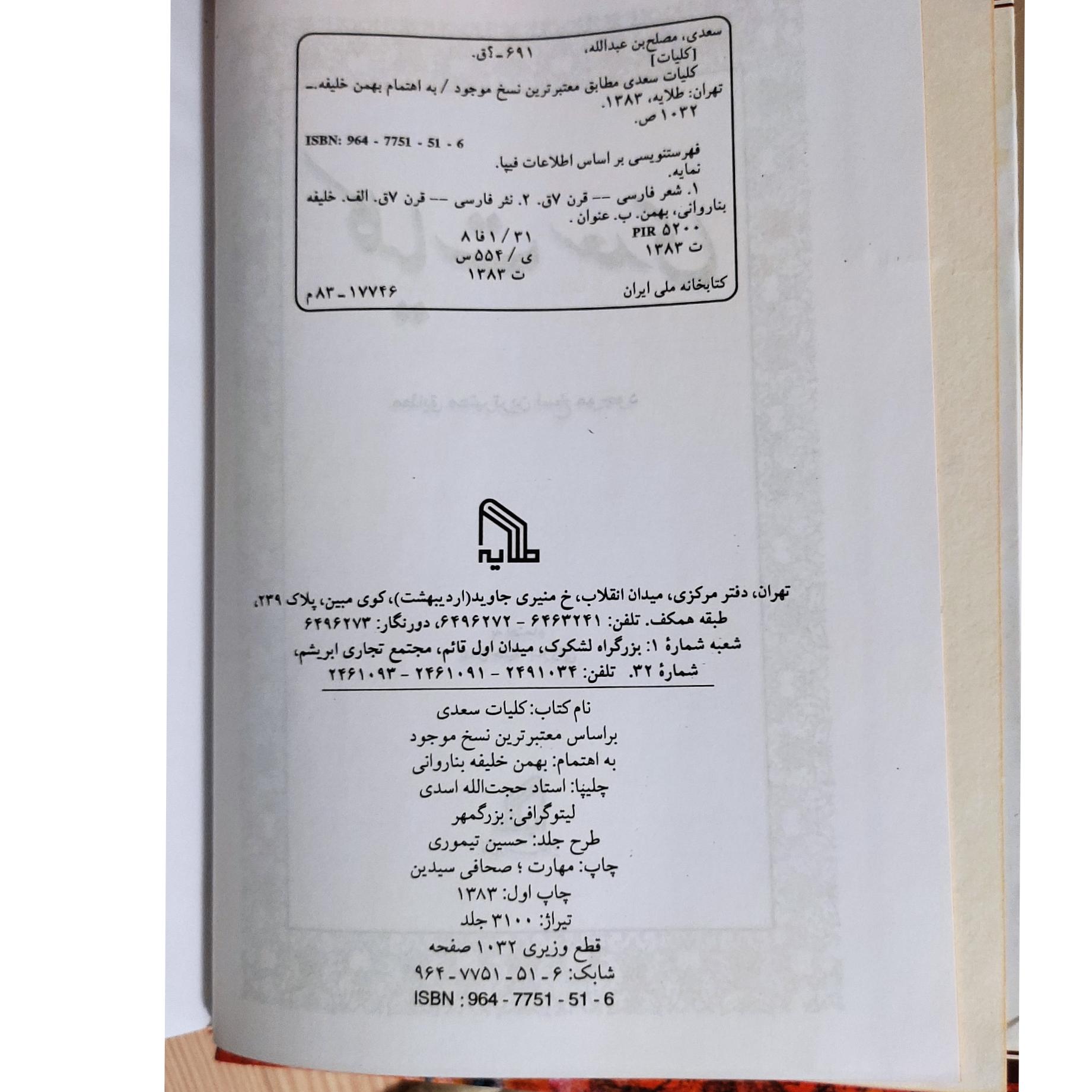 یکجلد کلیات سعدی باجلدسخت ؤقطع وزیری با 1032صفحه ودارای کشف الابیات:گلستان،بوستان،غزلیات،ترجیعات،رباعیات،ملحقات،مفردات،مواعظ(قصایدفارسی،مراثی،قصایدعربی،غزلیات، قطعات،رباعیات،مثنویات،مفردات ملحقات،رسائل نثر،ضمیمه:خبثیات،هزلیات ازانتشارات طلایه
