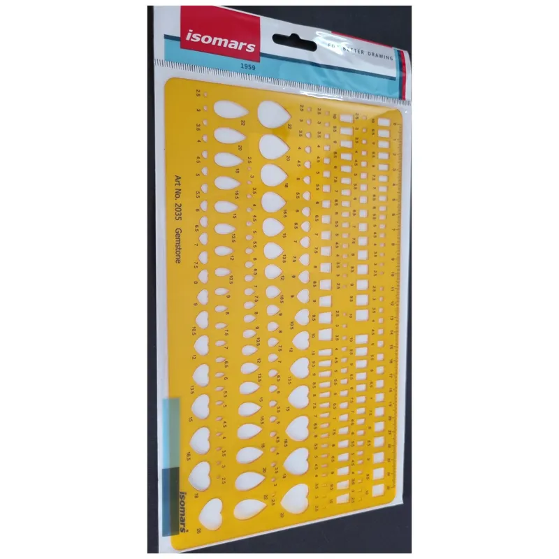 شابلون تخصصی همه کاره سنگ های قیمتی ایزومارس دارای طیف متنوعی از اشکال، از جمله قطره ،اشک، باگت ،قلب و مستطیل است.ابعاد و سایز سنگ دقیق مشخص شده است.سایز سنگ بصورت قیراط روی شابلون درج شده است .