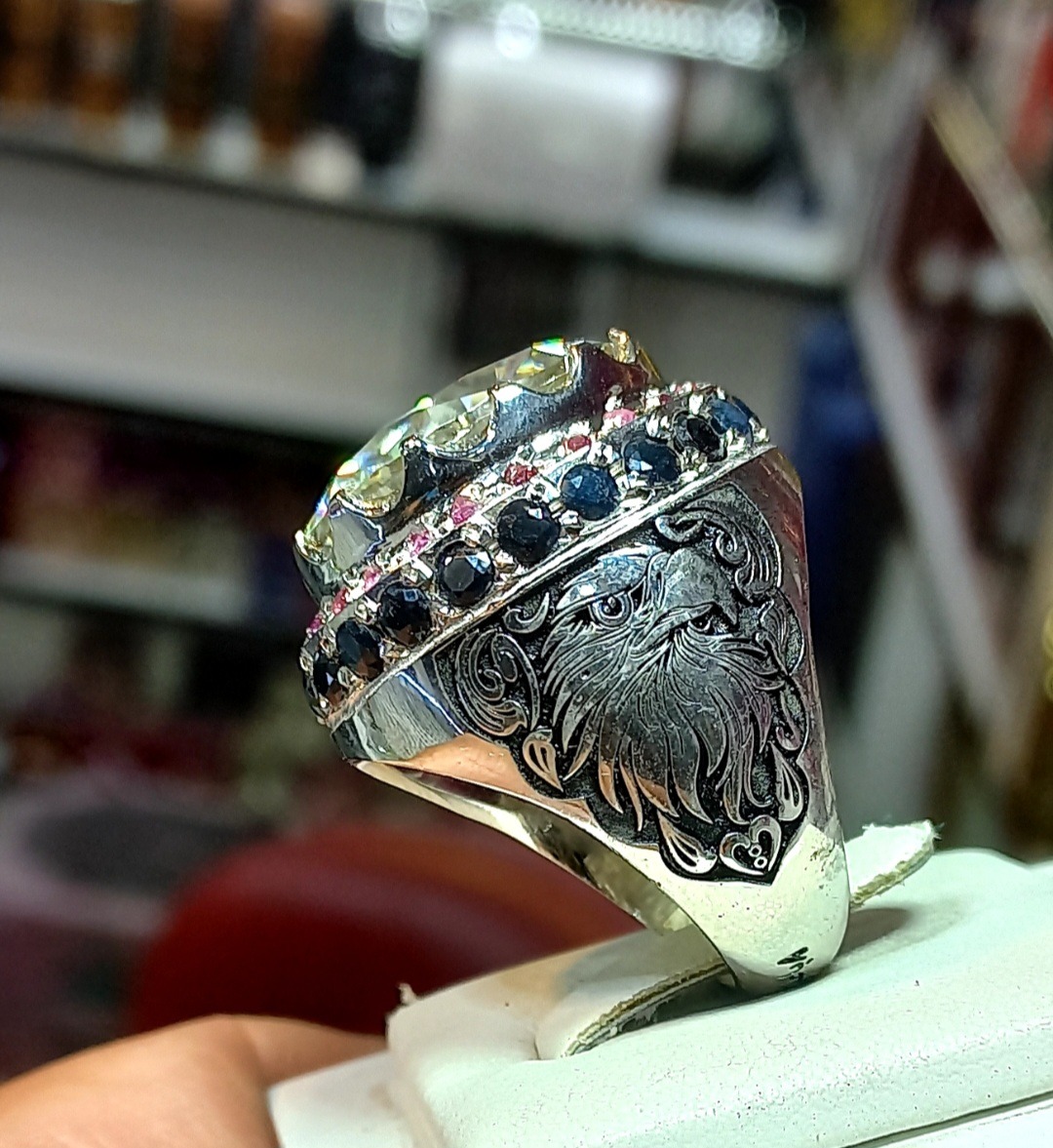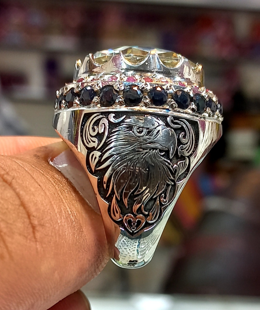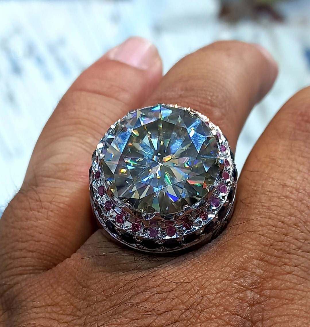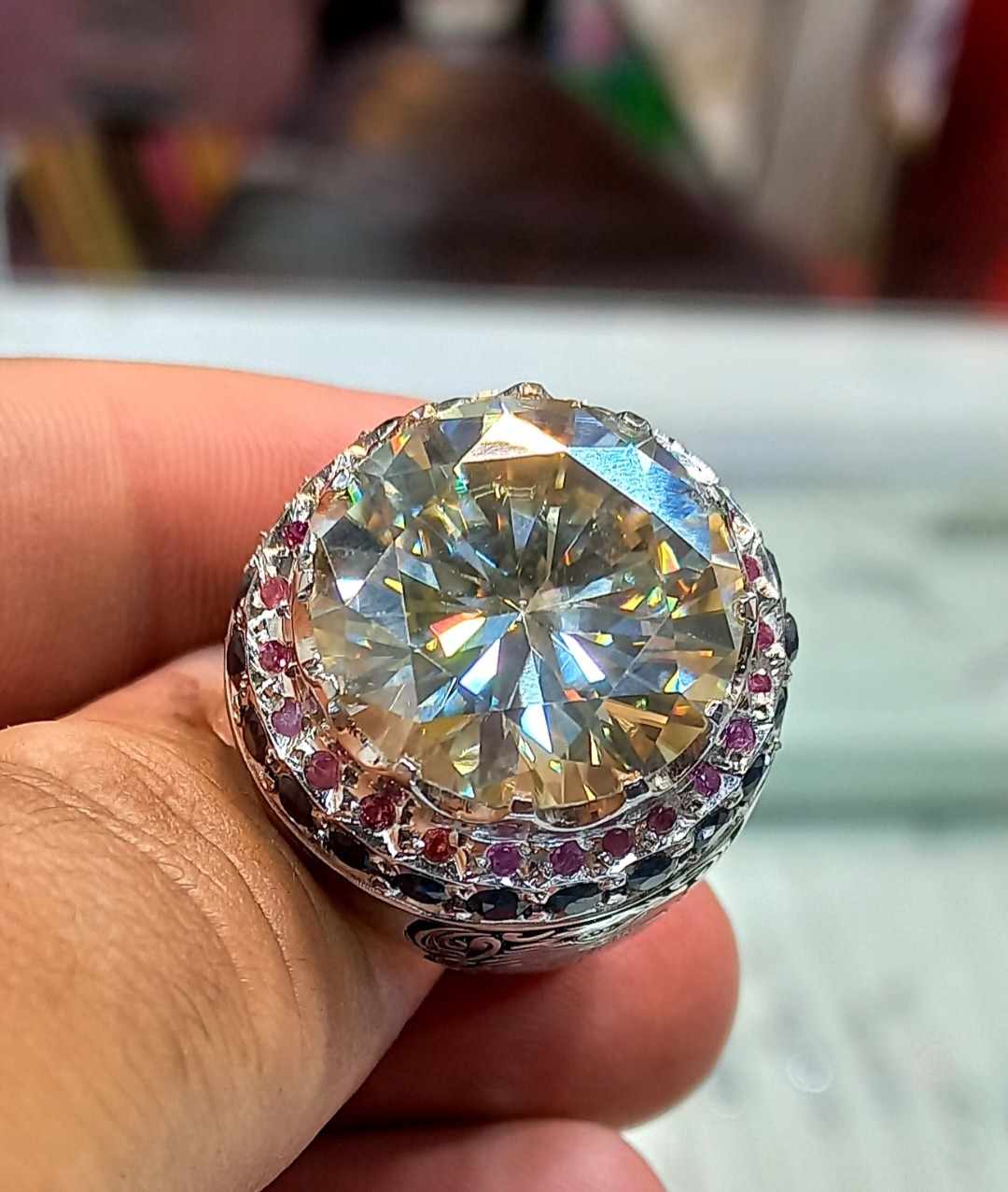 انگشتر موزانایت 30 قیراطی طلعلوع عالی بی نظیر مخراجکاری شده با 24 عدد یاقوت کبود آفریقایی(حدود 6 قیراط )