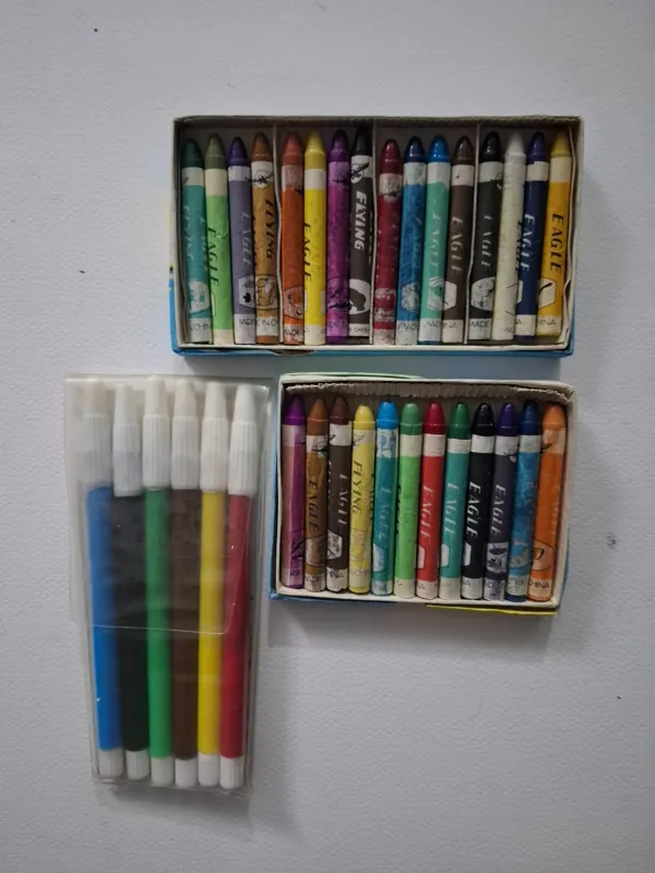 یک بسته مدادشمعی 16 رنگ + یک بسته مدادشمعی 12رنگ+ یک بسته ماژیک 6رنگ رنگین کمان، برای دهه 60، قیمت برای 3بسته میباشد