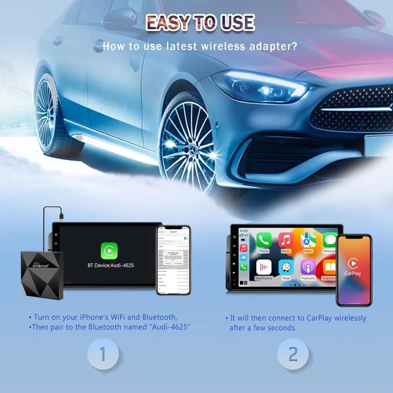 با این آداپتور بی سیم Carplay تنها در 10 ثانیه گوشی خود را به ماشین خود متصل کنید! دیگر خبری از سیم های آشفته در ماشین شما نیست - با استفاده از وصل و بازی، می توانید کارپلی سیمی خود را فوراً به کارپلی بی سیم تبدیل کنید.