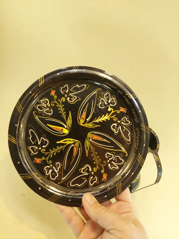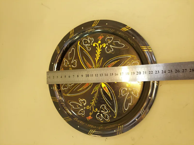 دور تا دور سینی نوشته داره و تاریخ ساخت و نام سازنده و شهر ساخته شده باکو هم درج شده کار برنجی و نقاشی دست و کاملا سالم هست و تاریخ 1991 درج شد روش