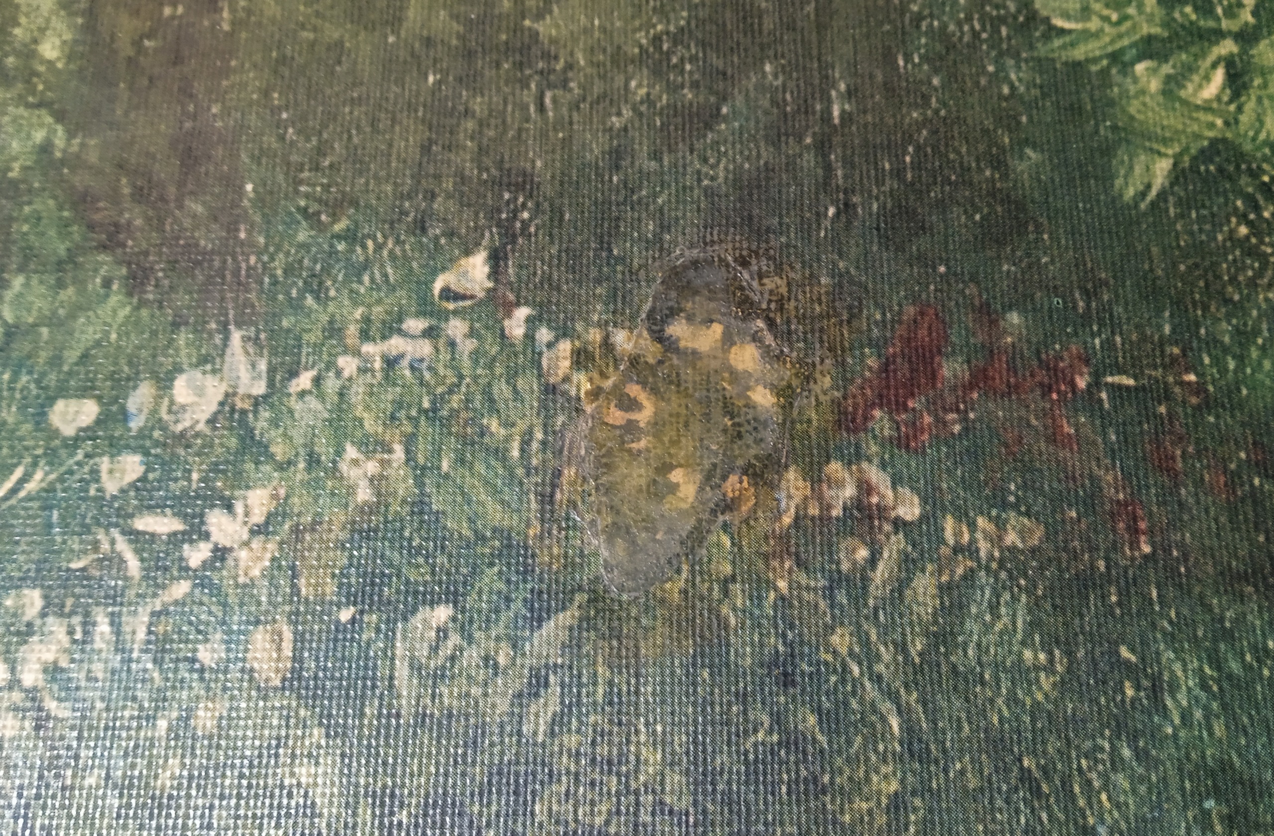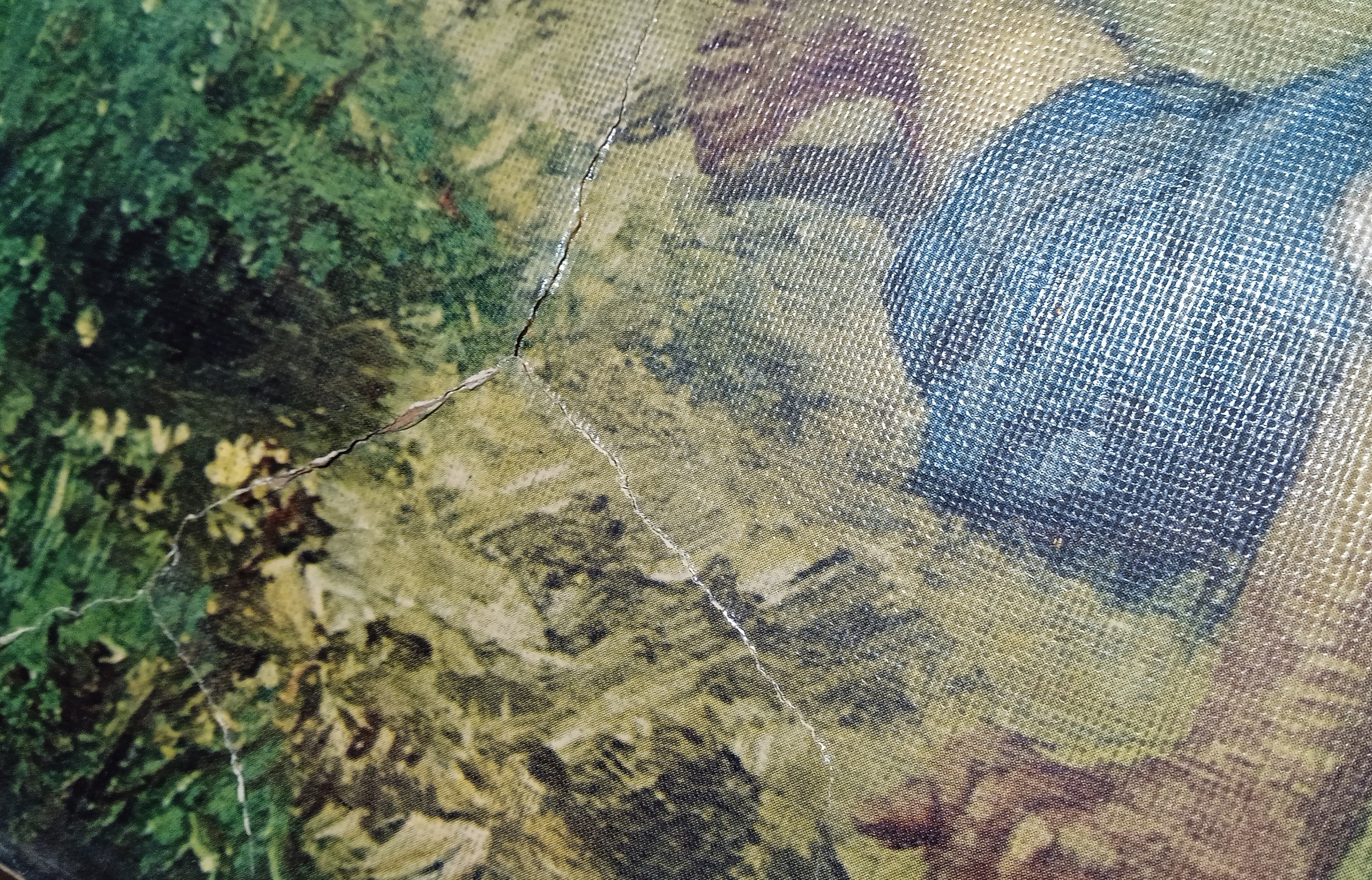 توجه : نقاشی در گوشه سمت پایین شکستگی دارد و در تمامی لبه ها لب پریدگی و شکستگی کوچک وجود دارد و همینطور تعدادی لک بر روی نقاشی
