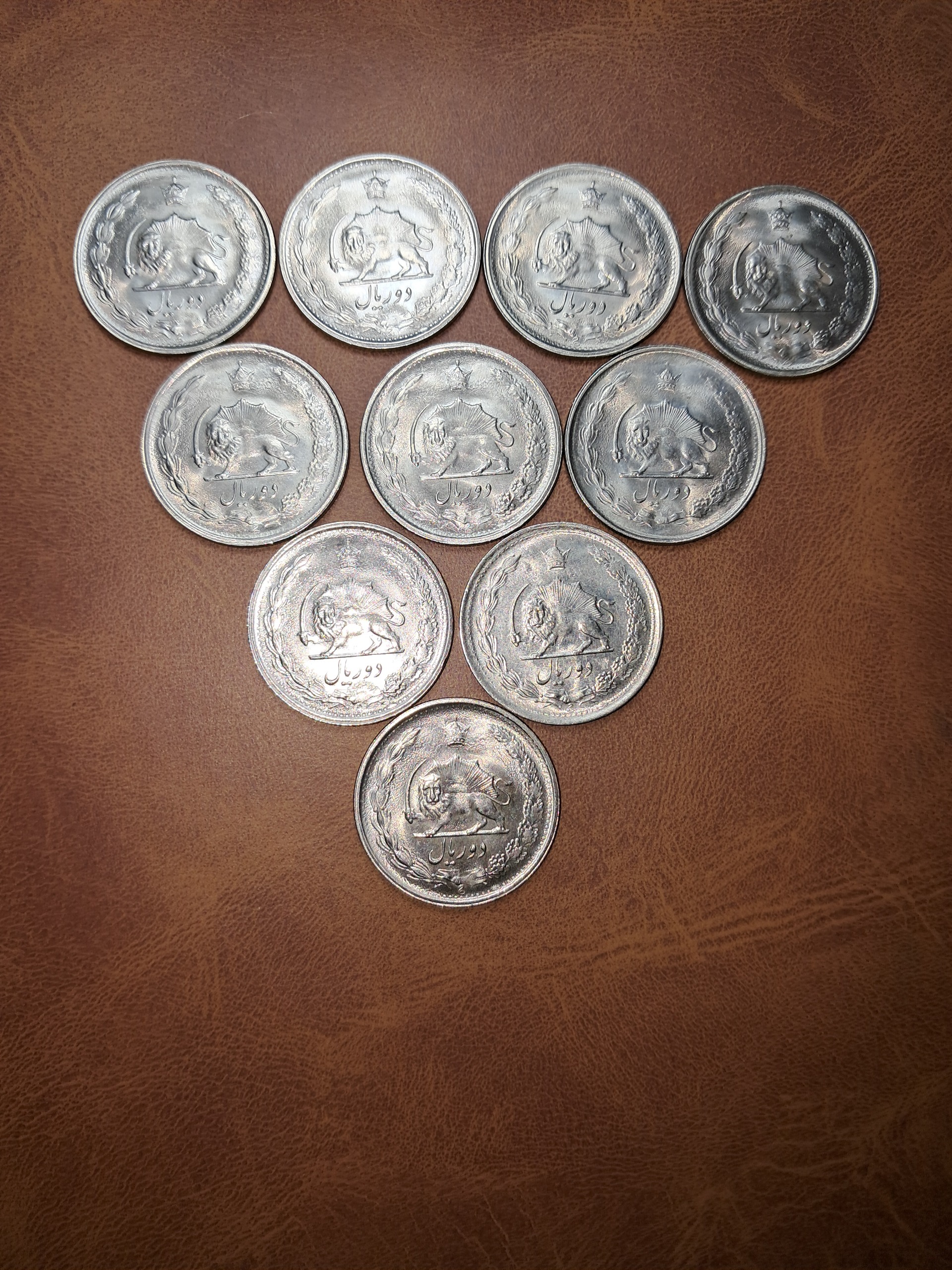 10 عدد سکه 2 ریال 2535 یادبود پنجاهمین سال شاهنشاهی پهلوی نو و تمیز و سالم ارور تقدیم میشود هر 10 سکه یک نقطه فلز روی عدد 2 هست و هر 10 سکه کف سکه شبح دارد و تاریخ 1525 گرفتگی قالب شده است . لطفا به کیفیت کالا در عکس دقت فرمائید . کالای ارسالی با تصویر ثبت شده مطابقت کامل خواهد داشت .