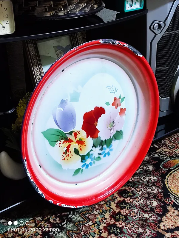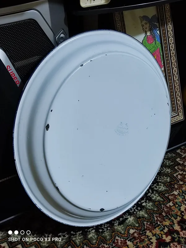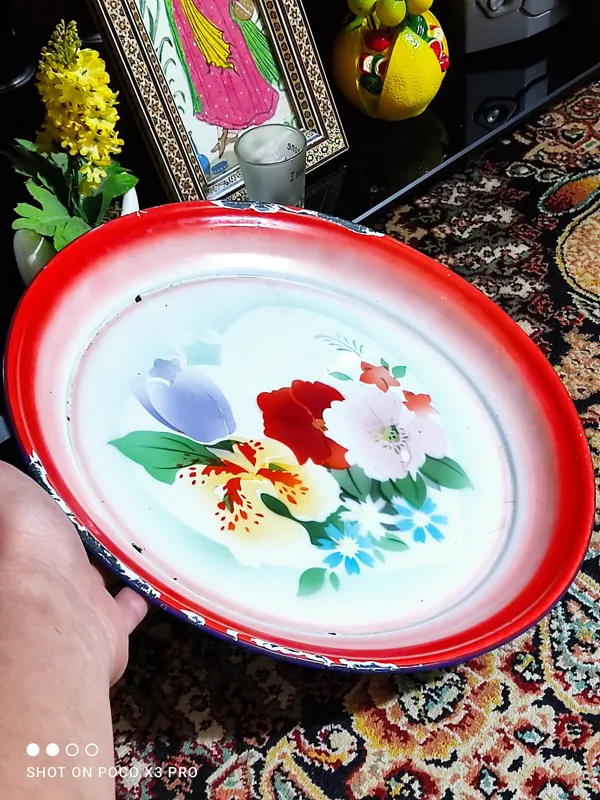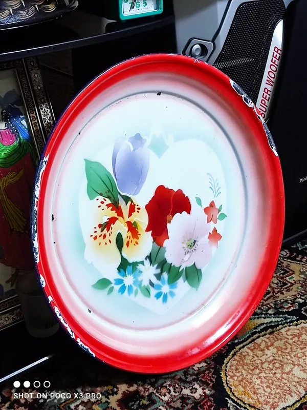 سینی لعابی قدیمی زیبا و جوندار مطابق تصویر این سینی نه غری داره نه خط و خش روشه فقط دو سمت سینی لعابش کنده شده خود سینی واقعا تمیز و بکره 35 سانت قطر سینی هست