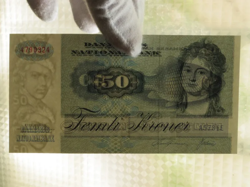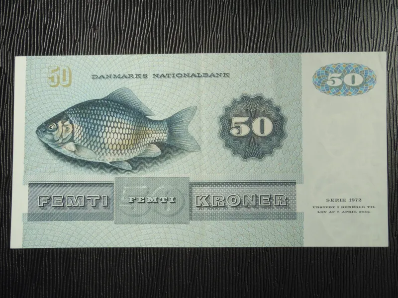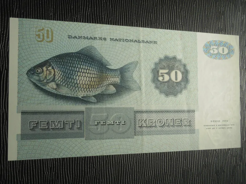 اسکناس زیبای اسکاندیناوی با تصویر عروس خانوادۀ رویبری، برگرفته از نقاشی معروفی به همین نام، اثر یِنس یوئل، نقاش دانمارکی در قرن هجدهم میلادی و تصویر ماهی بر روی دیگر
