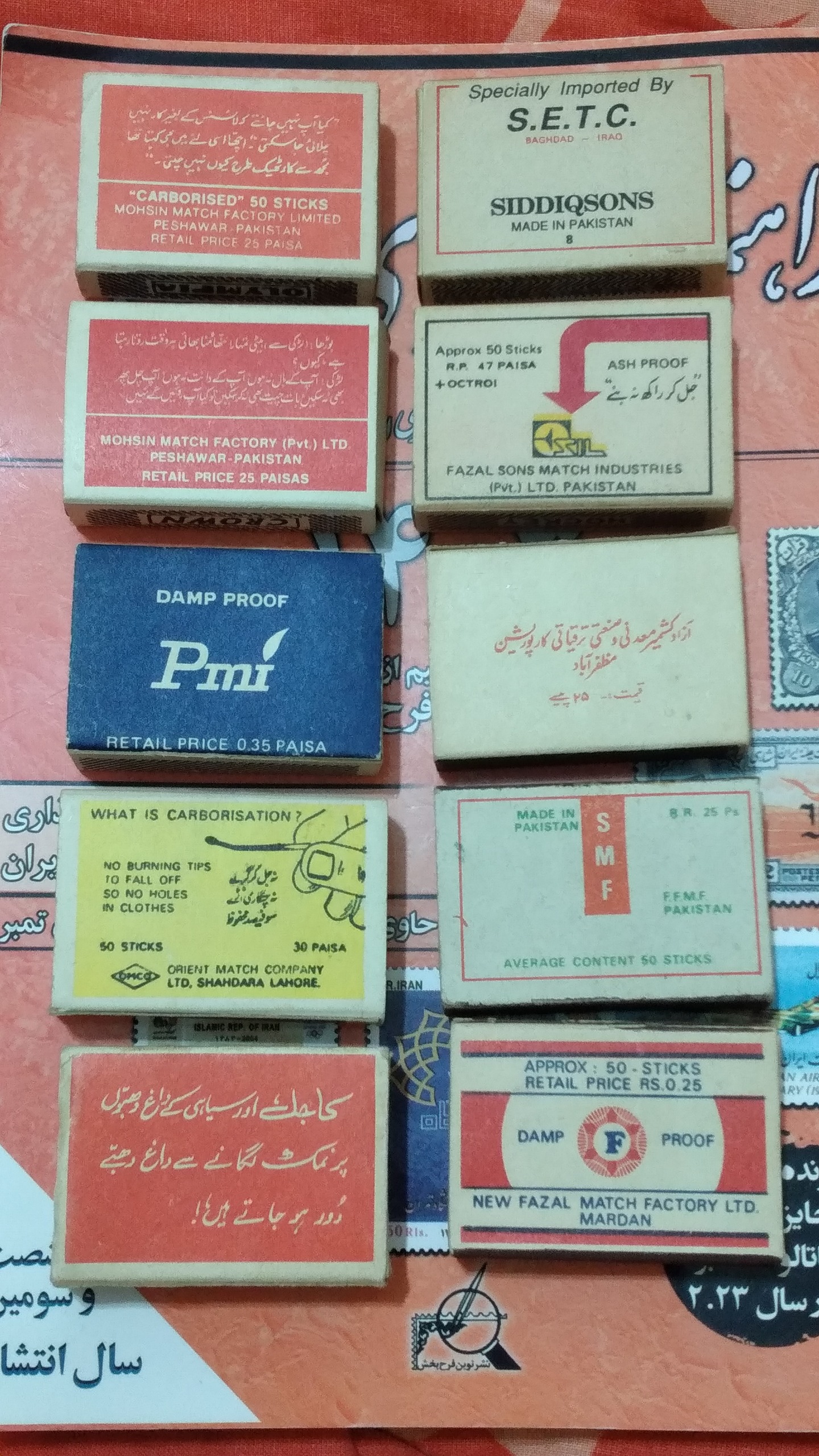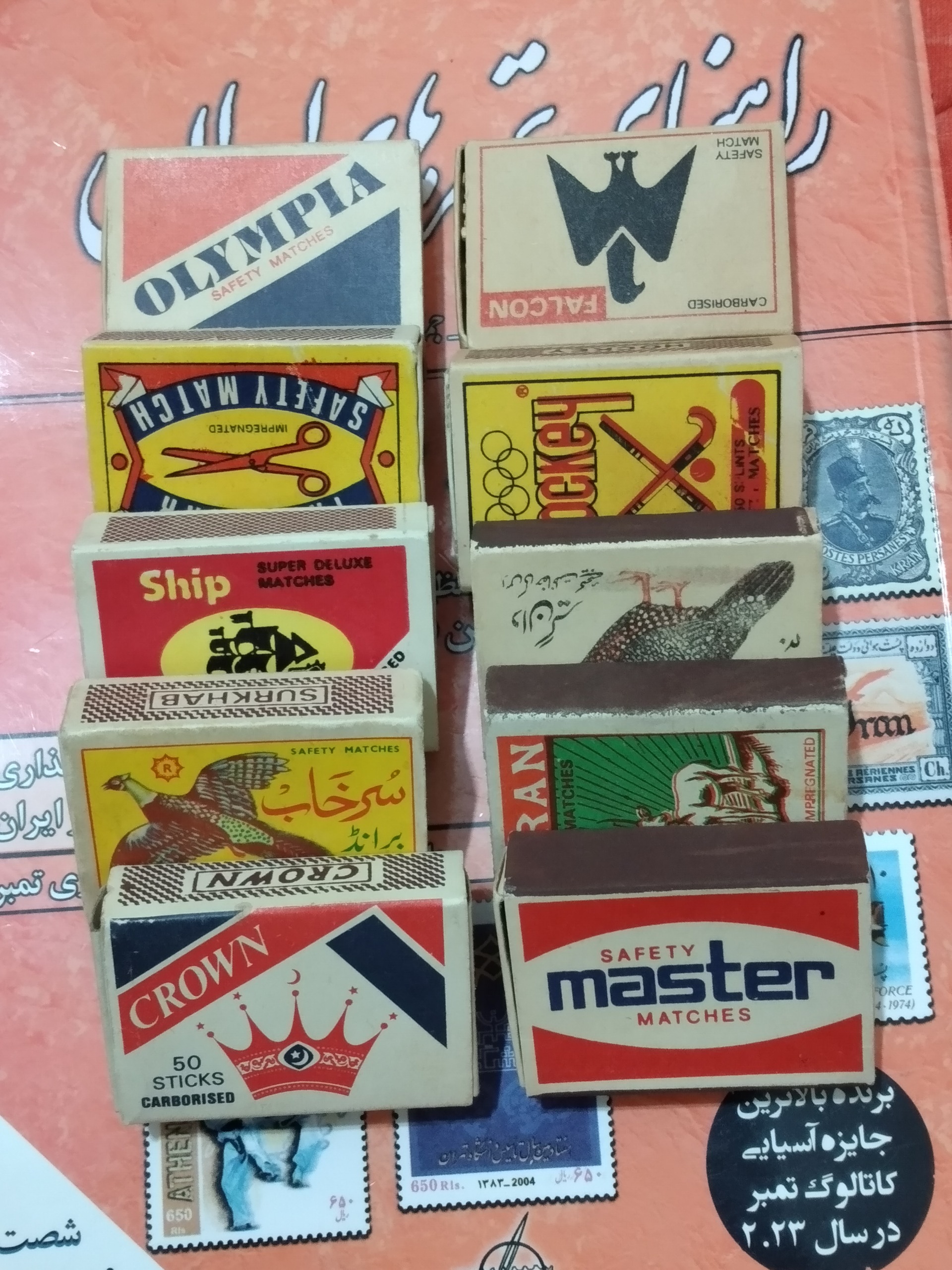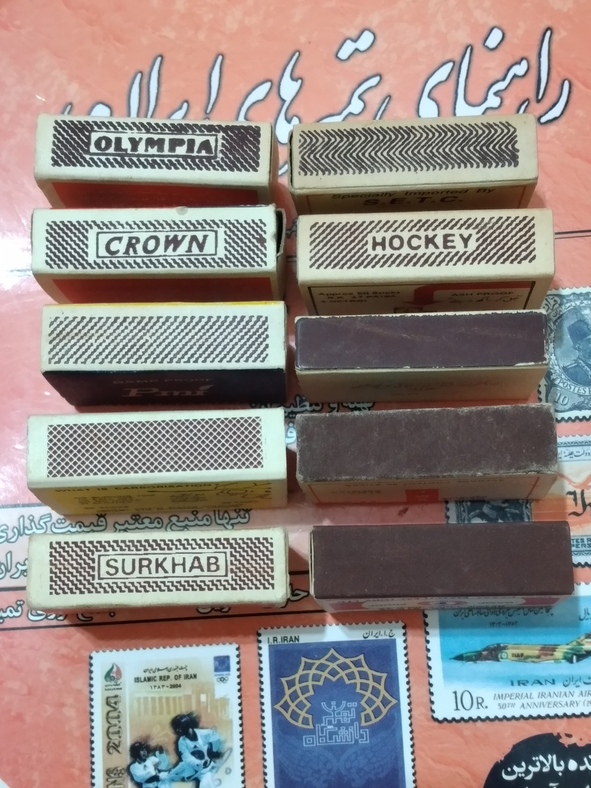 تعداد ده عدد کبریت قدیمی اواخر دوره پهلوی یا اوایل دوره جمهوری مطابق تصاویر