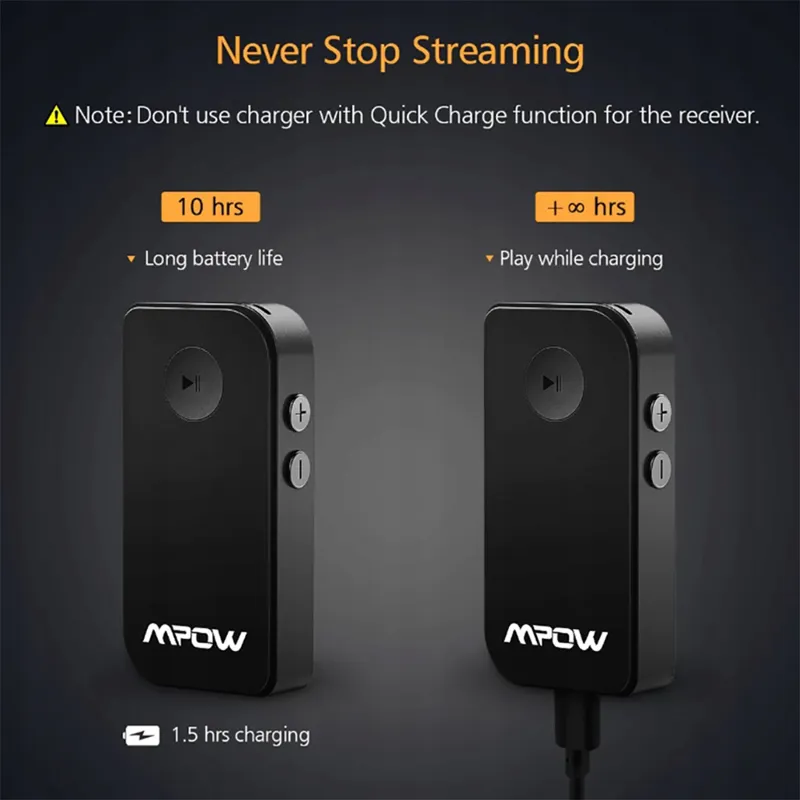 اتصال مجدد خودکار: هنگامی که یک رکورد جفت بلوتوث وجود دارد ، کافی است ابتدا بلوتوث تلفن همراه خود را روشن کنید ، سپس گیرنده بلوتوث را روشن کنید ، گیرنده بلوتوث MPOW می تواند به طور خودکار جفت شود . باتری داخلی بسیار طولانی : تا 10 ساعت زمان پخش را فراهم می کند و شارژ کامل آن فقط 1.5 ساعت طول می کشد .
