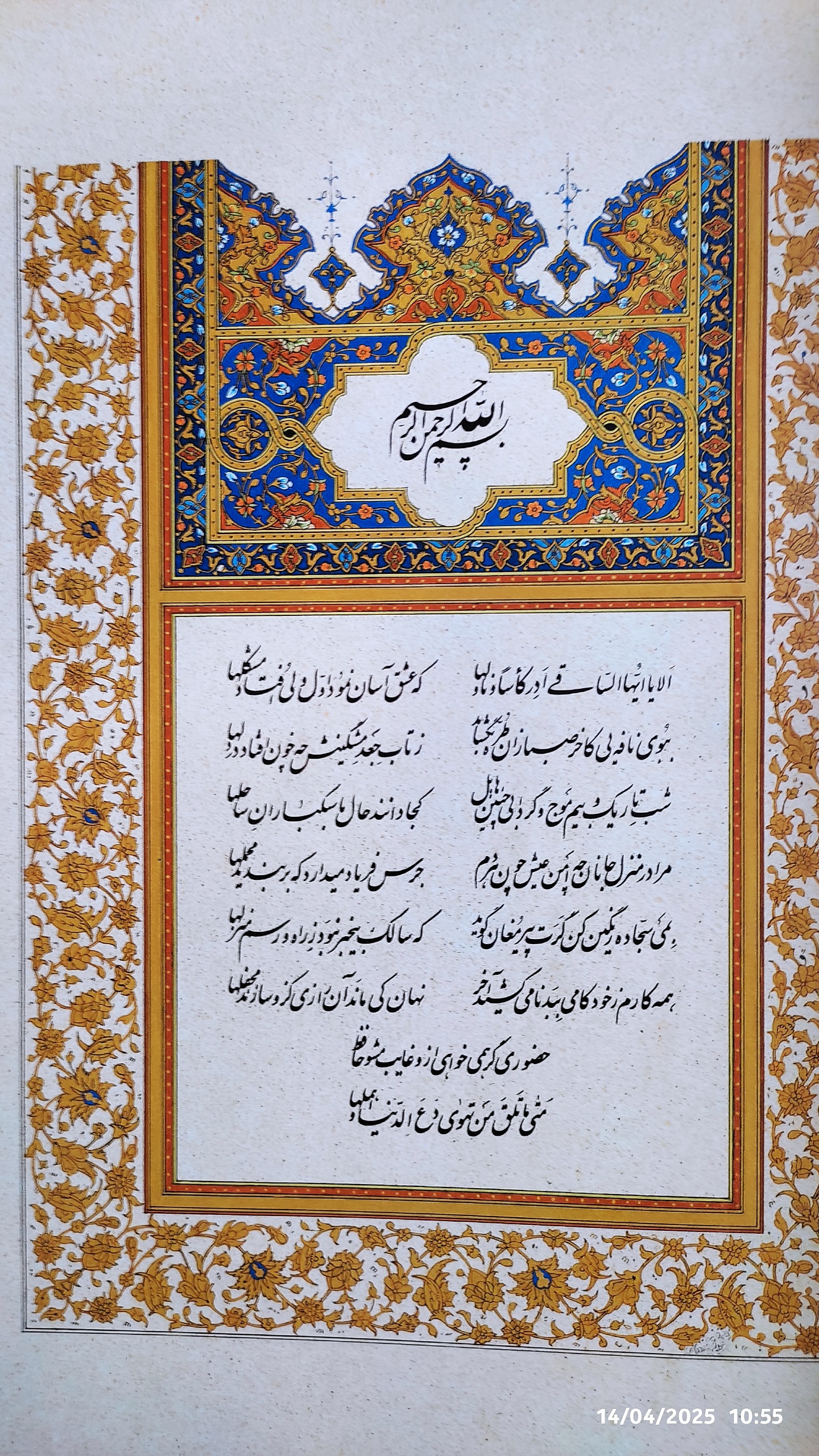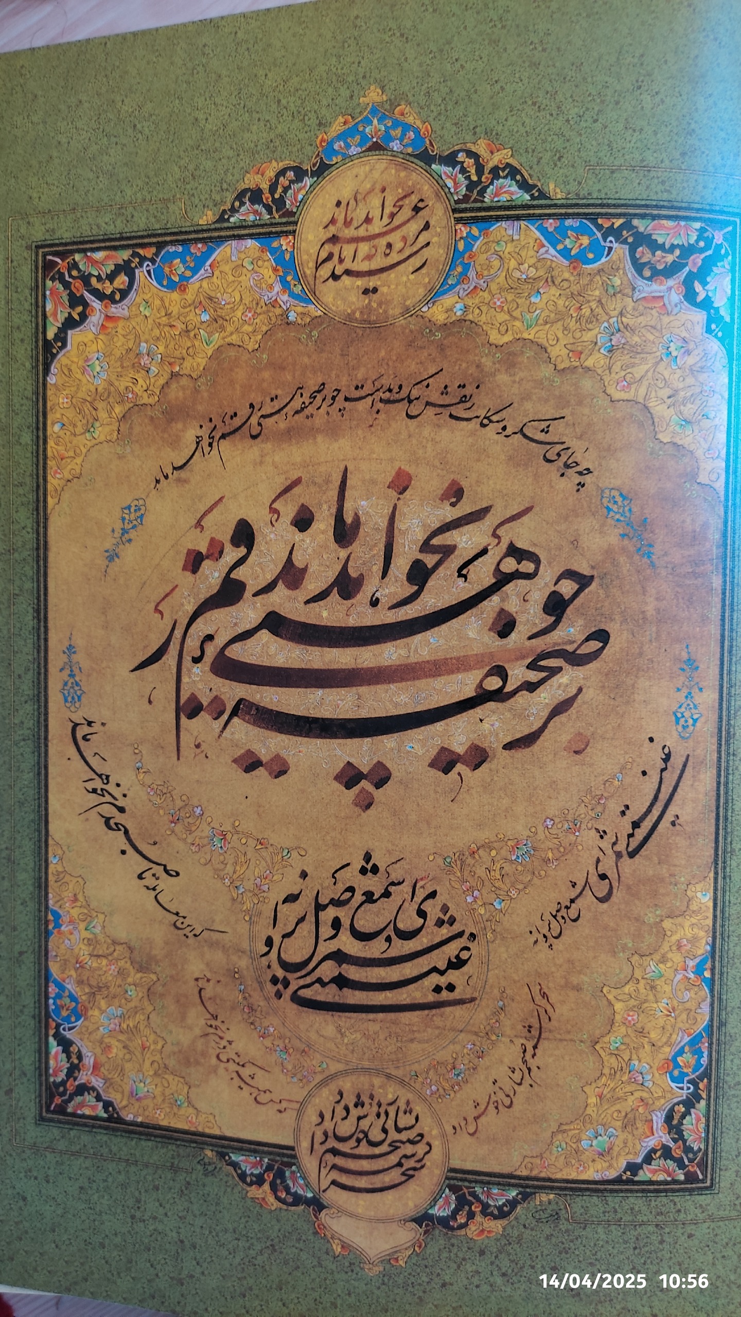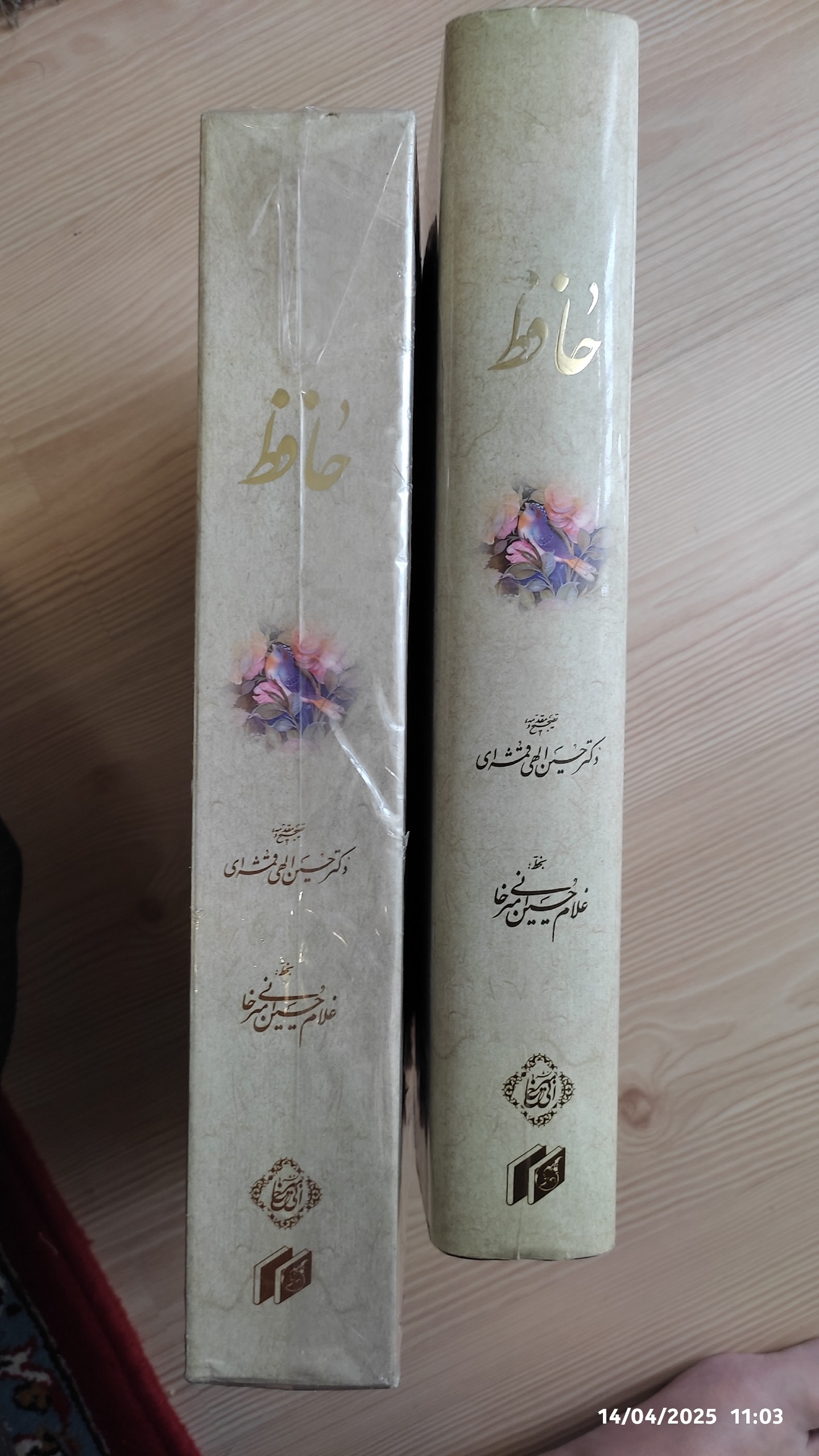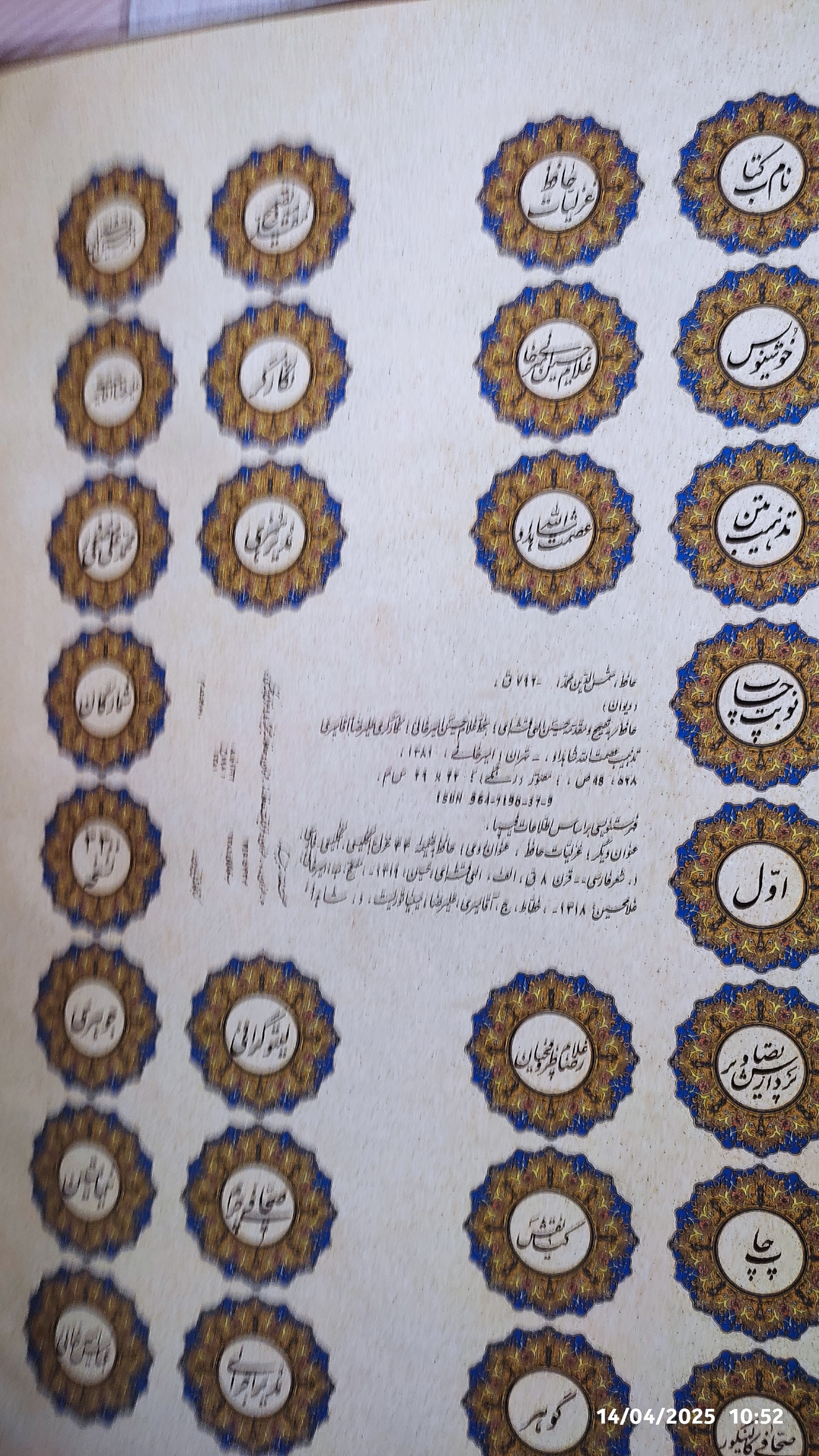 یکجلددیوان حافظ گلاسه رحلی دارای قاب کشوئی خط استادامیرخانی سایزکتاب35×25دارای روکش جلد گالینگور مقدمه دکترالهی قمشه ای نگارگرعلیرضاآقامیری ومدیرهنری محمدعلی منصور نوبت چاپ اول انتشارات فرهنگسرای میردشتی خطاط متن آقامیری ومینیاتوریست شاهدادبه ضمیمه44غزل وبه دوزبان فارسی وانگلیسی؛ کتاب نوبوده وجهت اطلاع ازمشخصات داخلی سلفون پاره وهنوز جهت اطمینان سلفون روی کتاب موجوده مدیراجرائی عباس امیرخانی دارای فهرست ابیات 528صفحه فارسی و46صفحه انگلیسی کتاب بعلت ضخامت برگهاسنگین وپس ازصحافی برگهابهم دوخته شده ازخریدارمحترم تقاضامیشودهرگونه سئوال یاابهامی داردقبل ازخرید سئوال و...مطرح وپس ازرفع ابهام خریدنمایدچون دربسته بندی وارسال اداره پست توجه چندانی ننموده واینگونه کتابهابعلت سنگینی ونفیس بودن آسیب دیده ودرآن صورت هم فروشنده وهم خریدارمتضرر