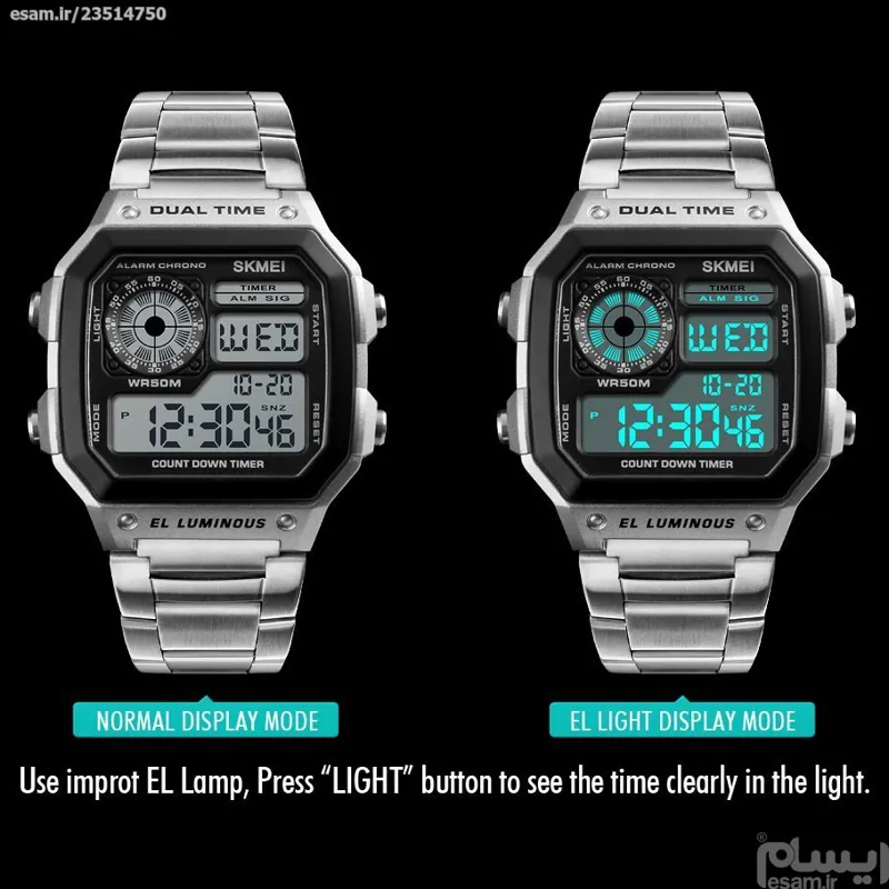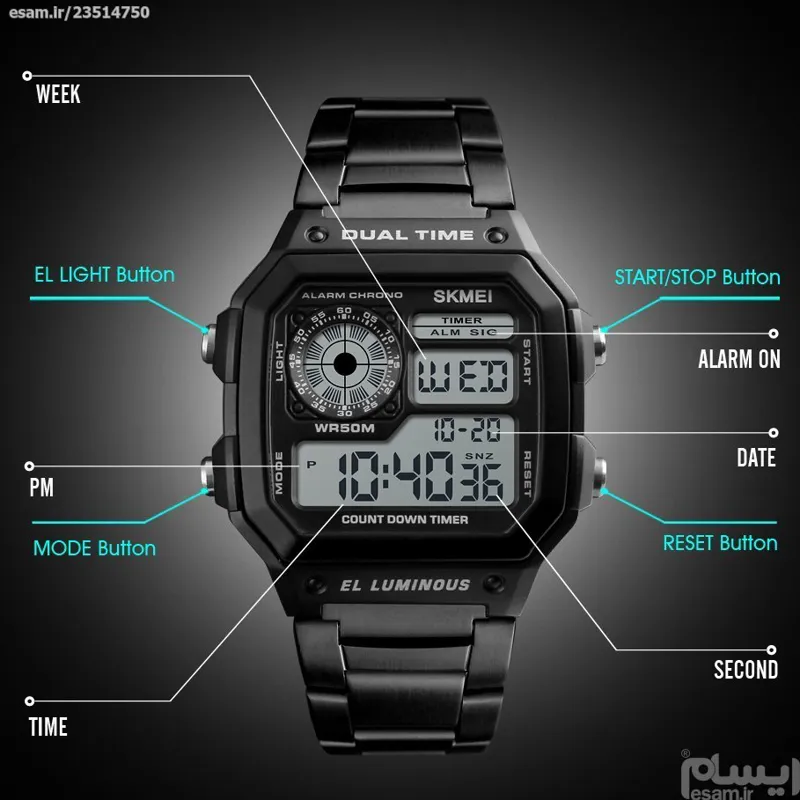 آلارم, بک لایت, تایمر, تقویم, دو ساعت همزمان, کرنومتر, نمایش 24 ساعته