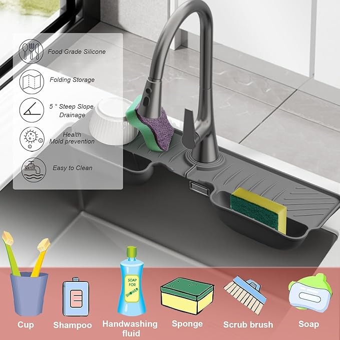 آبگیر سیلیکونی دور شیر یک محصول کاربردی برای جلوگیری از پاشیدن و تجمع آب اطراف شیر سینک است. این محصول با طراحی ساده و انعطافپذیر، دور پایه شیر قرار میگیرد و بهطور موثری آب را به داخل سینک هدایت میکند. در کنار این موارد از دو فضا برای قرار دادن شوینده و یا ابر های ظرفشویی بهره می برد. آبگیر باعث میشود تا سطح سینک همیشه خشک و تمیز بماند و از نفوذ آب به زیر سینک و آسیب به کابینتها جلوگیری شود.