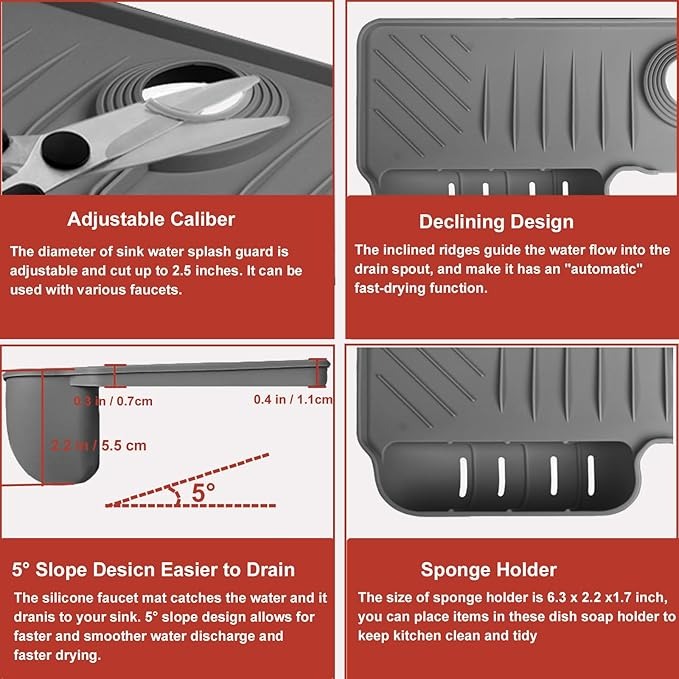 این محصول از جنس سیلیکون با ابعاد حدود 44.8 در 15.5 سانتیمتر طراحی شده است. قطر محل عبور شیر 6.5 سانتیمتر است و به خوبی در اطراف شیر سینک قرار میگیرد. آبگیر با هدایت آب به داخل سینک، از تجمع آب روی سطح و زیر شیر جلوگیری میکند. همچنین، جنس سیلیکونی آن نرم، قابل انعطاف و مقاوم در برابر آب است.