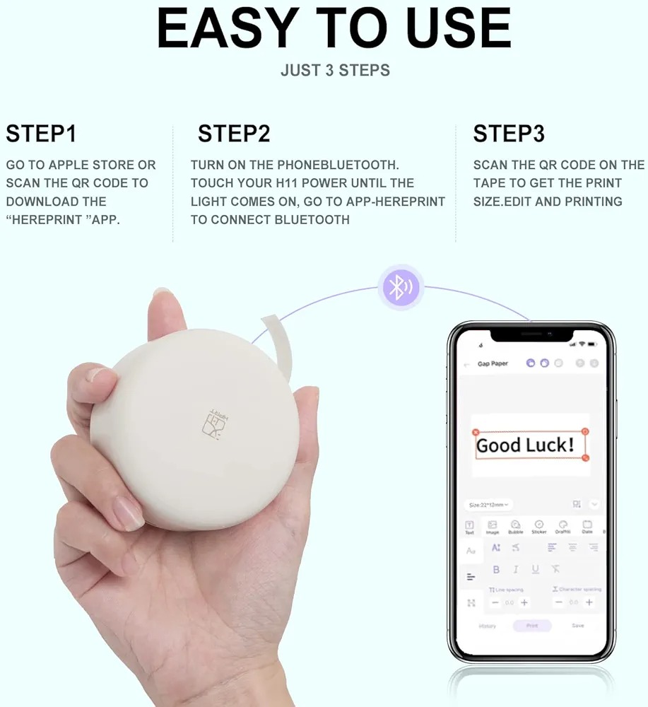 راه اندازی آسان- چاپگر برچسب بلوتوث 4.0 با برد اتصال 10 متر، سازگار با تلفن های iOS/Android. ظرفیت باتری 1000 میلی آمپر ساعت است و می تواند حدود 11 رول برچسب را به طور مداوم پس از اتمام شارژ چاپ کند.