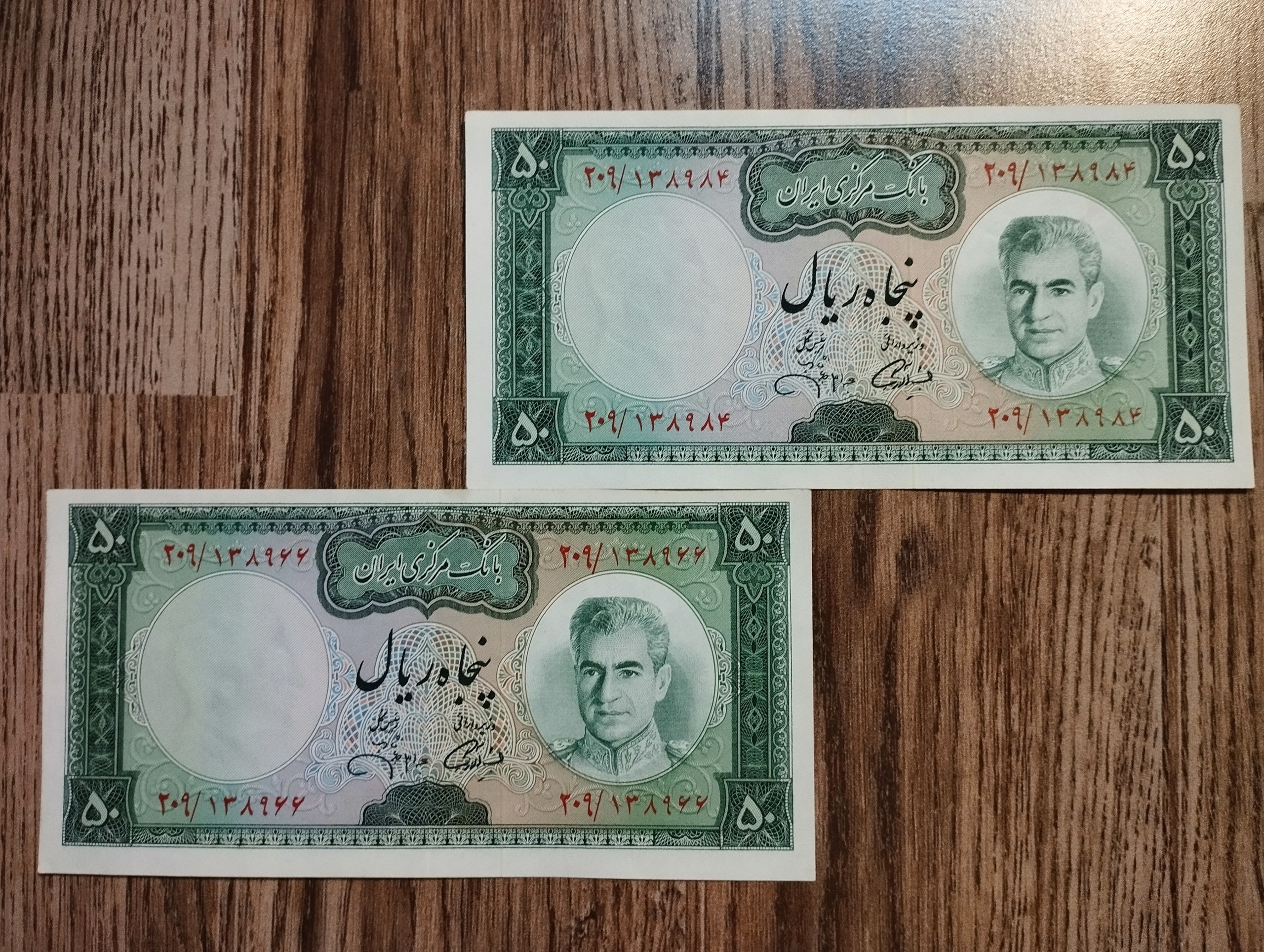 دو برگ اسکناس 50 ریال محمدرضاشاه یقه نظامی