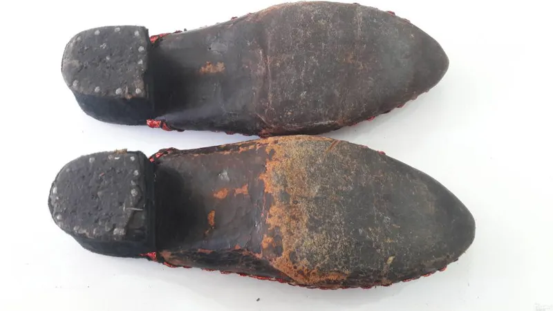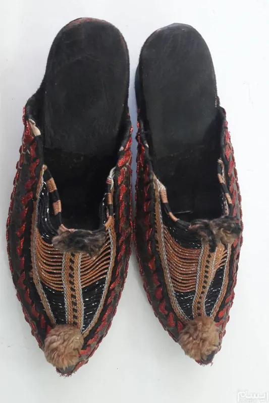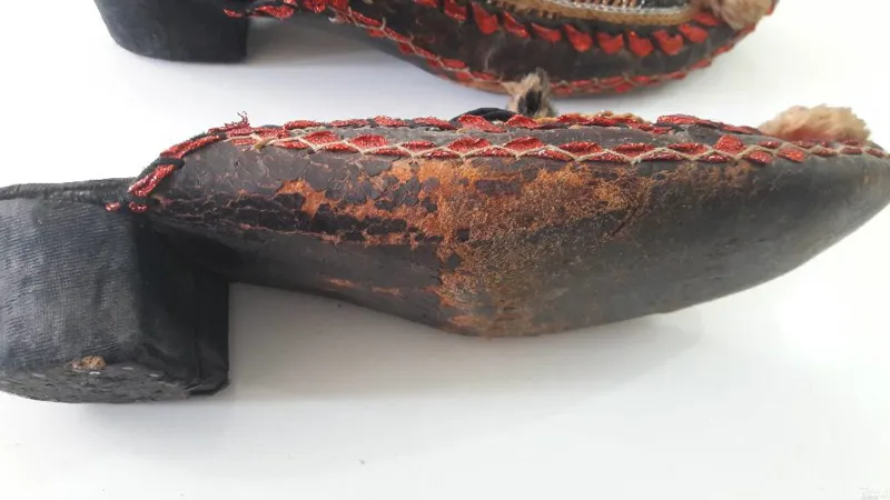 یک جفت چاروق زنانه قدیمی دست دوز با کف و زیری چرمی. سالم هستن و احتمالا از دوره قاجاریه و نخ دوزی روش احتمال بالا ابریشم هست .