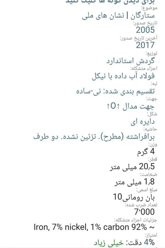 اسکن خود سکه می باشد از بعضی سکه تعداد هست برای انتخاب دوستان به صورت جداگانه در فروشگاه چیده شد تصاویراسکن ارائه شده از کالا ملاک خرید قرار دهید  در تصاویر دوم سوم چهارم توضیحات کامل هست از ابعاد وزن  قطر کالادر خرید خود دقت کنید