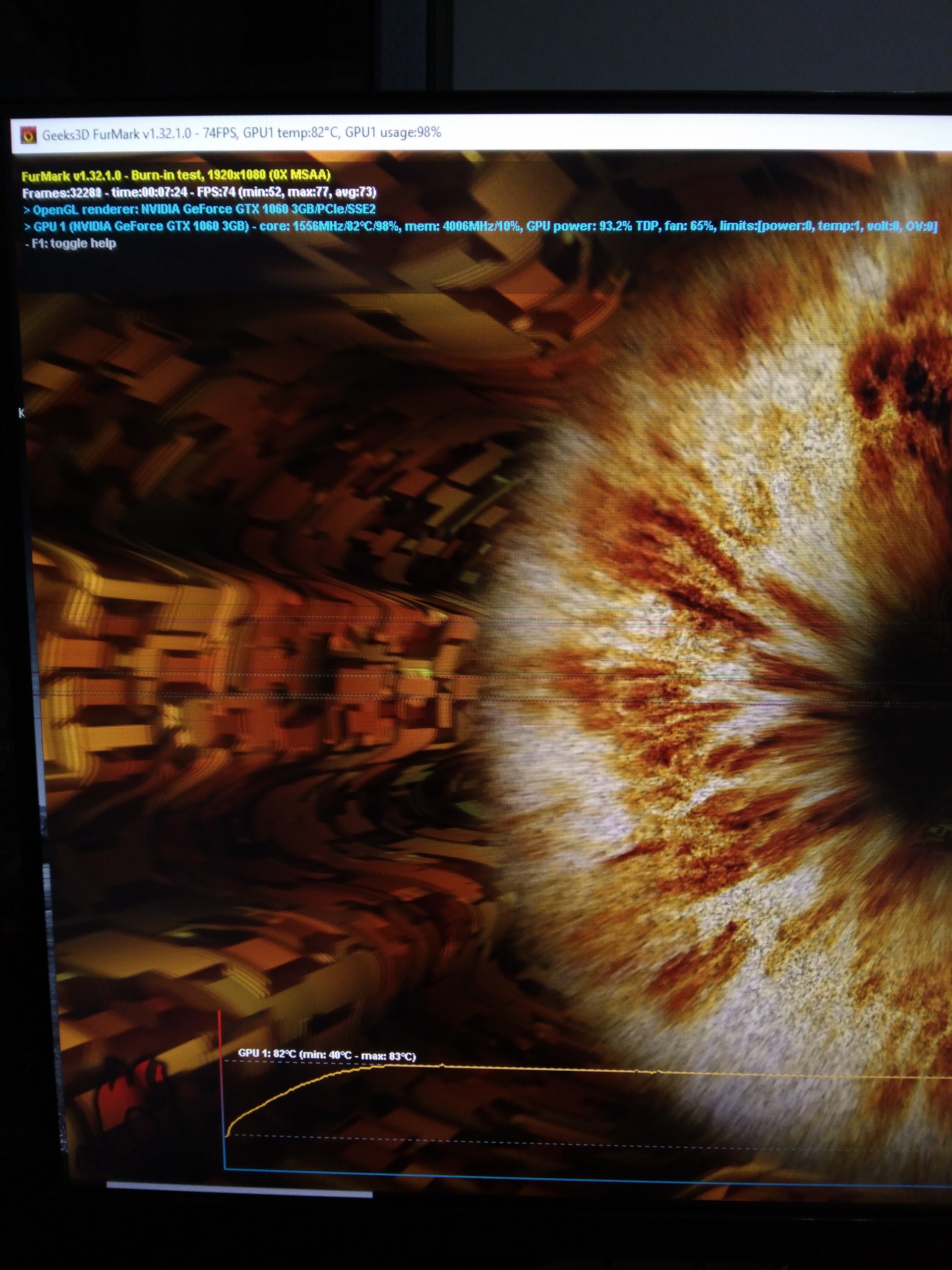 نتیجه تست فورمارک که نهایت فشار وارد شده به گرافیک در حدود 8 دقیقه و رزولیشن 1920*1080 FHD که در عکس آخر قرار داده شده (مشاهده فرمایید) دما کارت نهایت به 82 درجه میرسه که نشان از سلامت گرافیک میباشد و دمای این کارت نسبت به تک فن بودنش کاملا نورمال میباشد