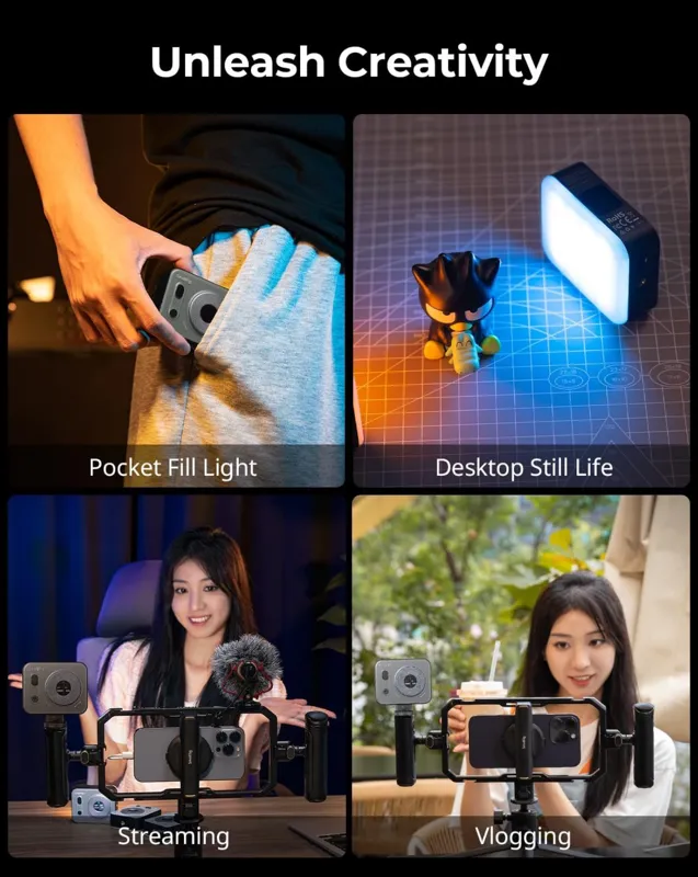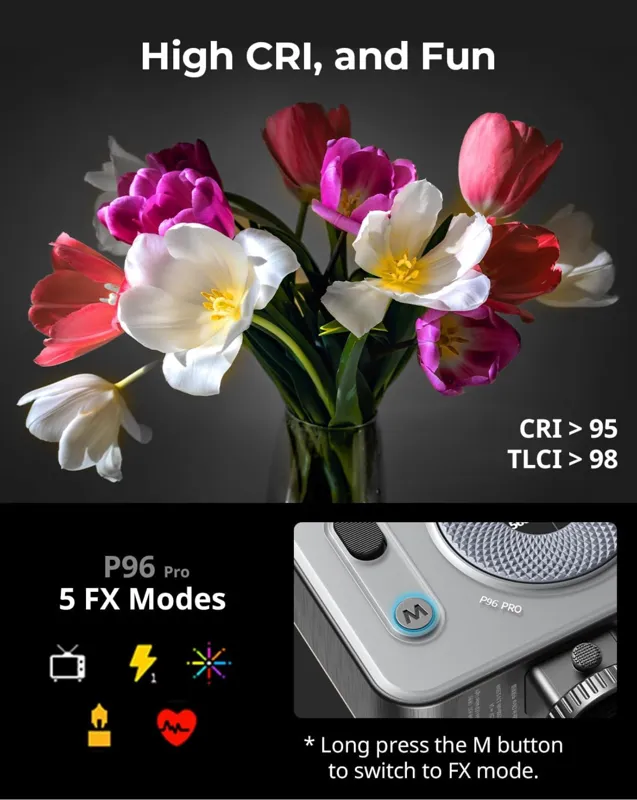 عملکرد حرفهای منبع نور دو رنگ 5 واتی ممتاز با CRI > 95 و TLCI > 98، با ارائه 1160Lux در 0.3m/5600K، مناسب برای تولیدکنندگان محتوای مبتدی، علاقهمندان به عکاسی، پخش زنده در حال حرکت و موارد دیگر.