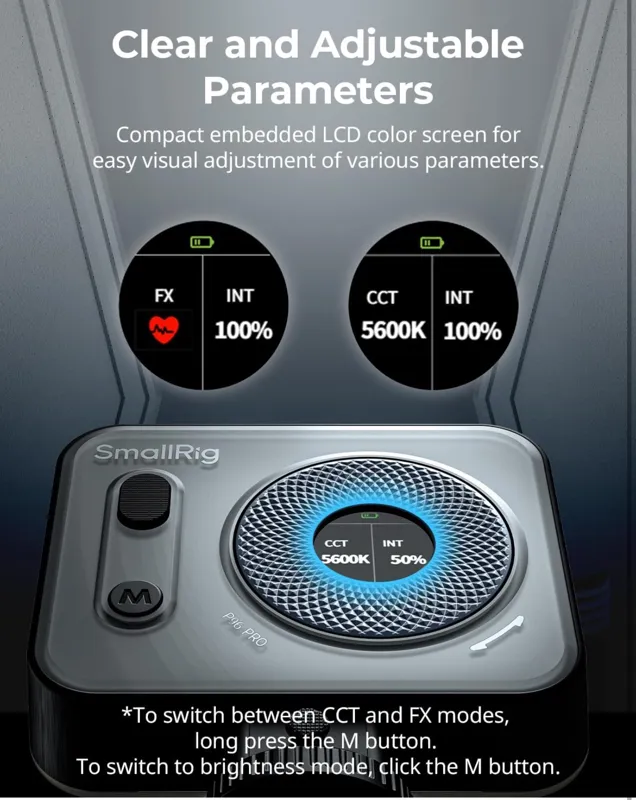 ارتقاء جدید Vibe P96 Pro محصول نسل دوم از سری چراغهای Vibe LED شرکت SmallRig است. این چراغ که از طراحی نمادین حلقهای فلزی بدون دستگیره بهره میبرد، اکنون دارای یک صفحه نمایش رنگی LCD تعبیه شده برای نمایش واضح پارامترهایی مانند دمای رنگ و روشنایی است که امکان تنظیم آسان با یک دست را فراهم میکند.