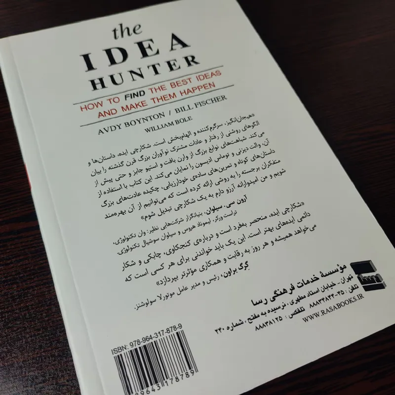 «شکارچی ایده» کتابی الهام بخش و عمل گراست که شما را تشویق می کند تا در دنیای اطراف خود به جستجوی فرصت های خلاقانه بپردازید و ایدههای کوچک را به موفقیتهای بزرگ تبدیل کنید. اگر به دنبال جرقه ای برای آغاز مسیر نوآوری هستید، این کتاب همراهی عالی خواهد بود.