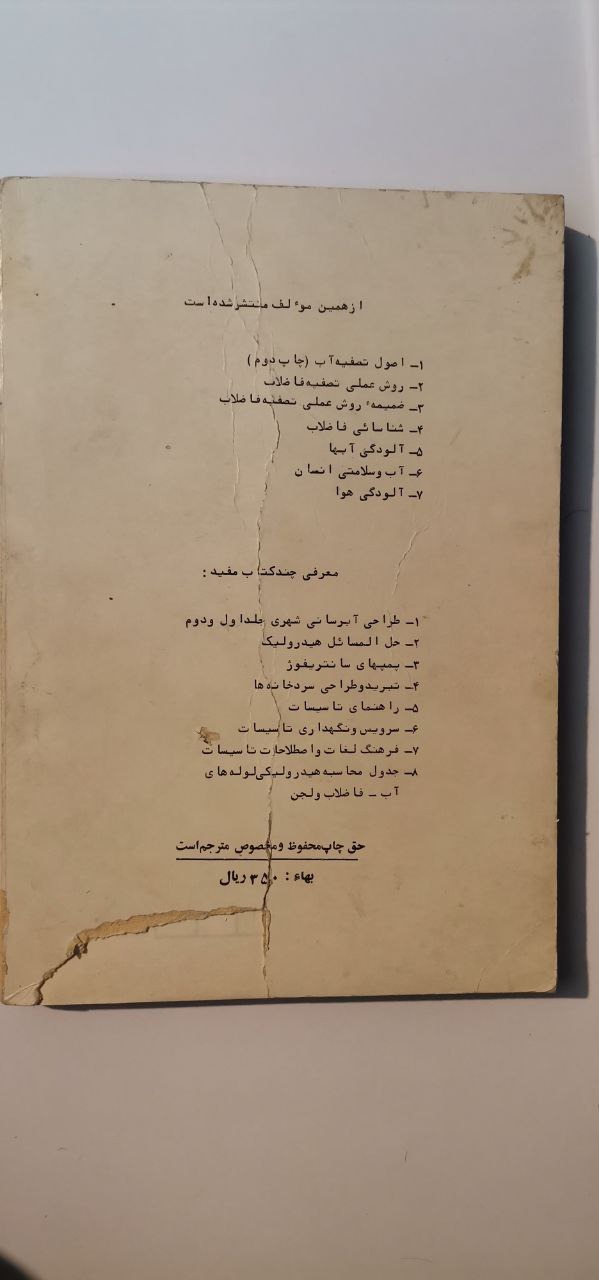 کتاب دارای مهرخوردگی هست . به دلیل قدیمی بودن کمی جای چروک یا پارگی عادیست و کمی پارگی در جلد پشت کتاب مطابق عکس
