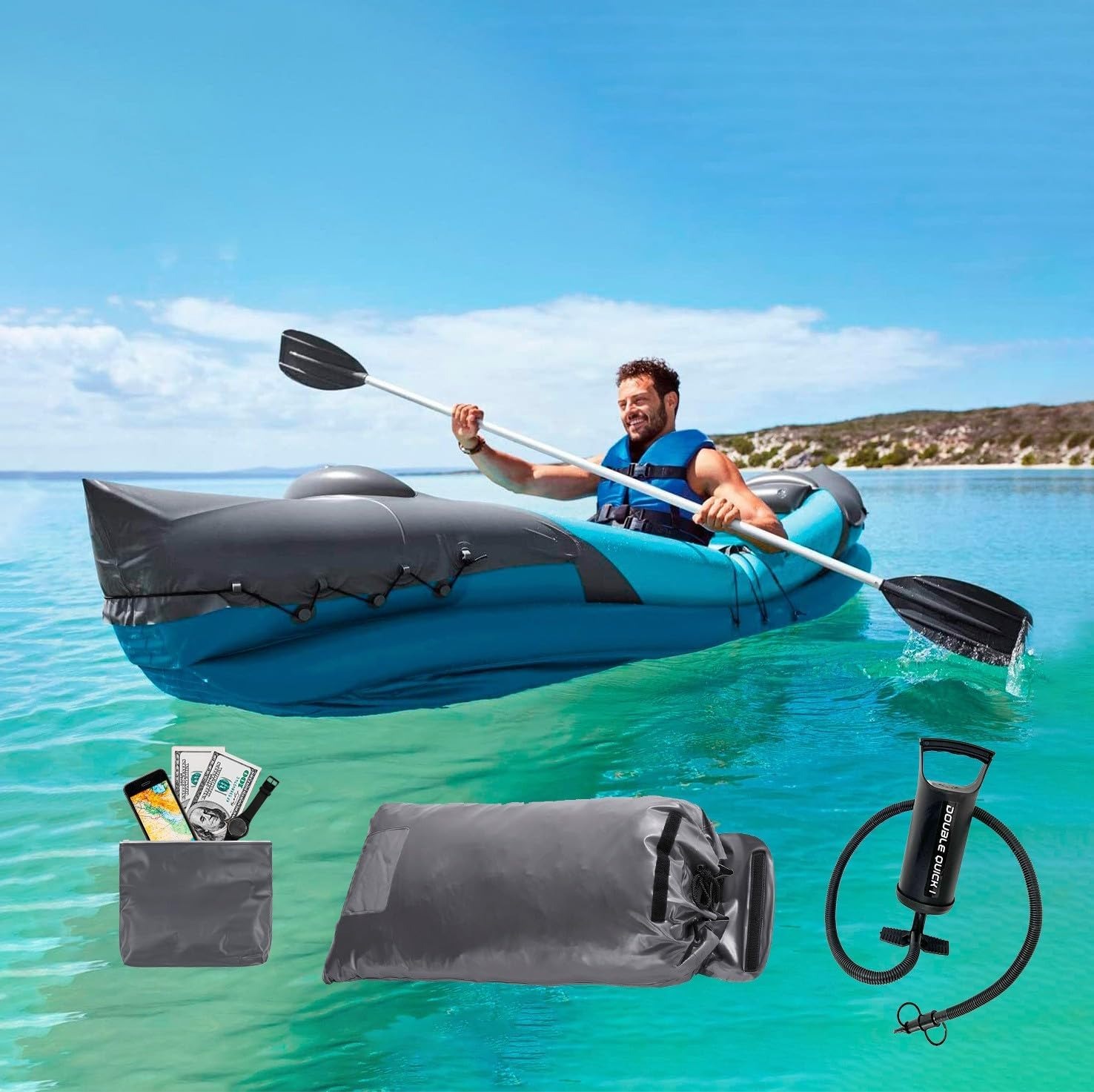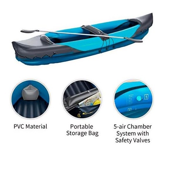 کایاک بادی با 5 محفظه باد ،قایق بادی دو نفره با پاروی آلومینیومی دوبل،کایاک دو نفره ساخته شده از پلاستیک بادوام و با کیفیت بالا،قایق بادی دو نفره به همراه کیت تعمیر