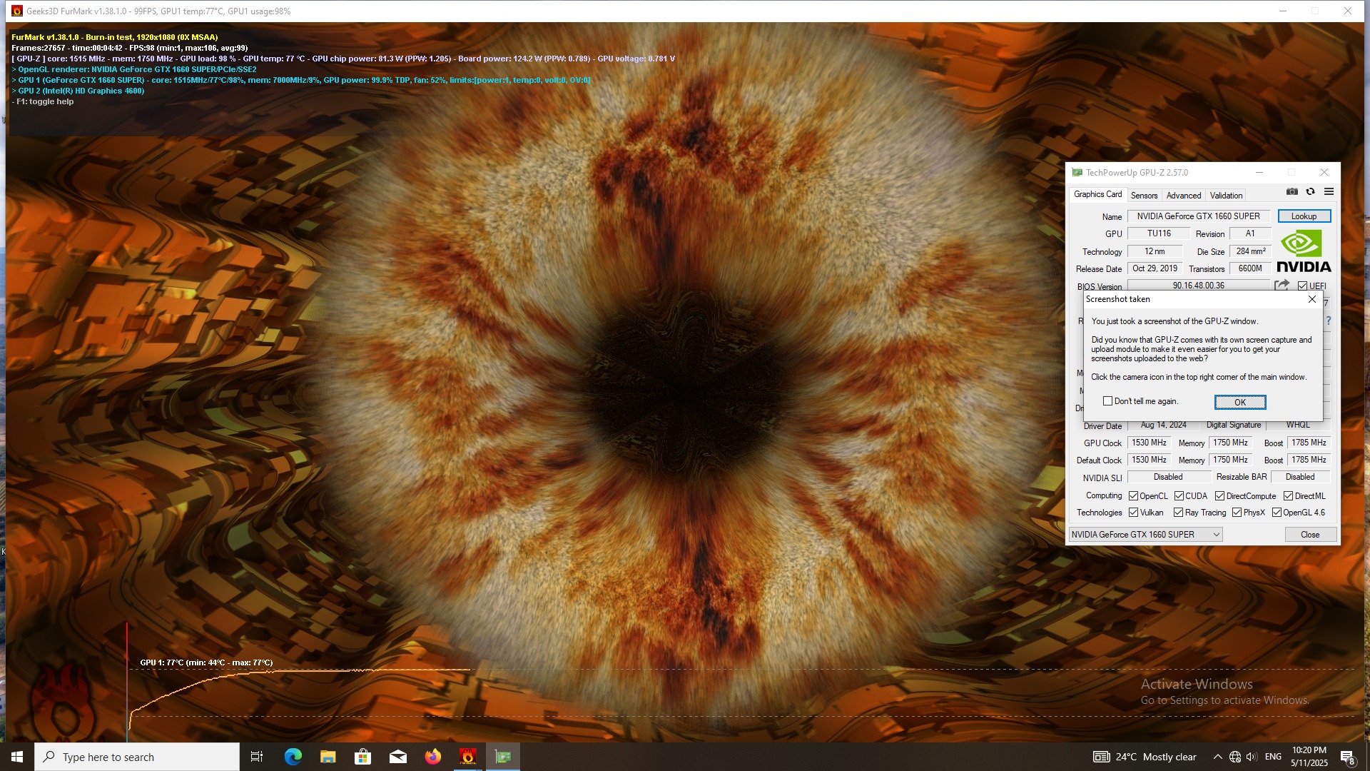 نتیجه تست فورمارک که نهایت فشار وارد شده به گرافیک در حدود 5 دقیقه و رزولیشن 1920*1080 FHD که در عکس آخر قرار داده شده (مشاهده فرمایید) دما کارت نهایت به 77 درجه میرسه که نشان از سلامت گرافیک میباشد
