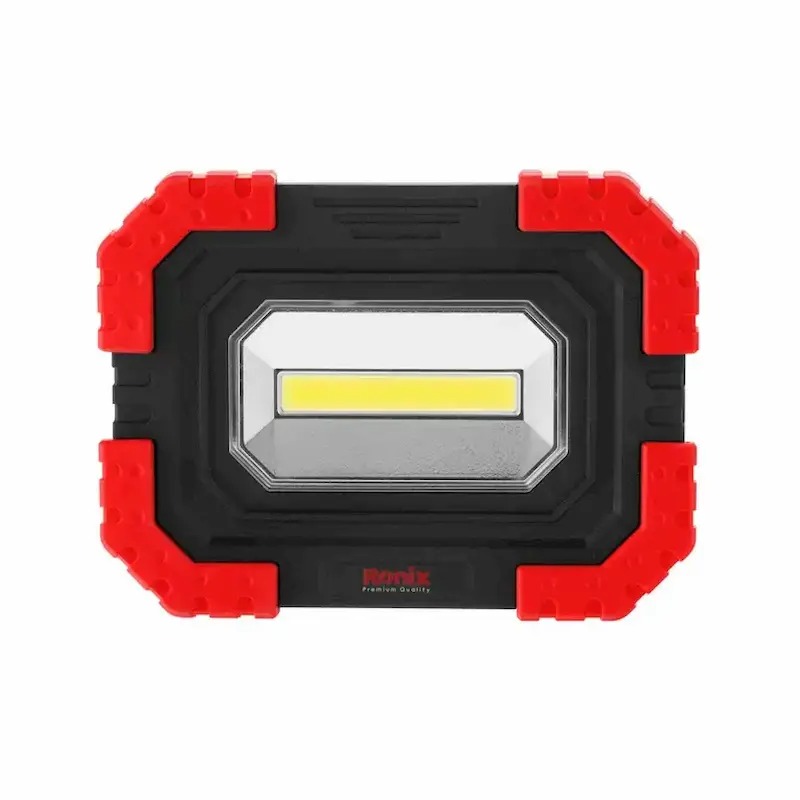برای خرید نورافکن شارژی باید به دنبال چه ویژگیهایی باشید؟ قطعا باتری بادوام، روشنایی زیاد و تناسب معقول بین قابلیت حمل و میزان نوردهی! با نورافکن کتابی شارژی رونیکس مدل RH-4273، همه جا را مثل روز روشن ببینید! این ابزار روشنایی حرفهای، دارای الایدی COB 10 وات با توان روشنایی 900 لومن است. منبع تغذیه این محصول، یک باتری 3.7 ولتی 4400 میلی آمپر ساعتی لیتیوم یونی است که در حالت پرنور، 3 ساعت بیوقفه کار میکند. این نورافکن شارژی با دامنه روشنایی 30 متر، دارای دستهای است که تا 180 درجه قابلیت چرخش دارد و میتوانید آن را در 6 موقعیت مختلف تنظیم کنید. از این ابزار پرکاربرد، به عنوان پاوربانک نیز استفاده میشود. بدنه پلاستیکی این ابزار، موجب وزن سبک و در عین حال مقاومت بالای آن شده و جابهجایی آن را آسانتر میکند.
