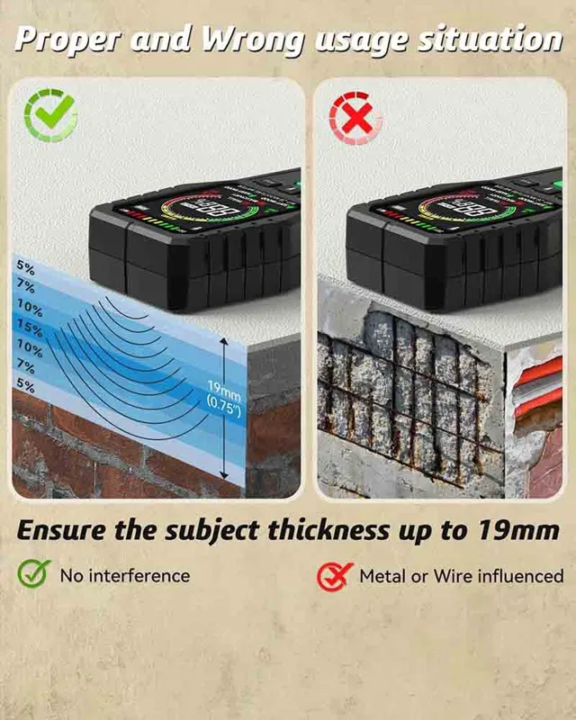 رطوبت سنج چوب تا عمق 0.75 اینچ نفوذ می کند، بنابراین مواد تر که در زیر موضوع شما قرار دارند نیز می توانند بر خوانش تاثیر بگذارند، مانند میخ های فلزی، میز کار، دست شما و غیره.
