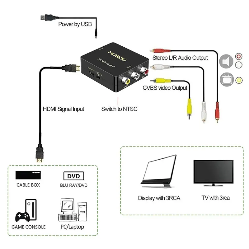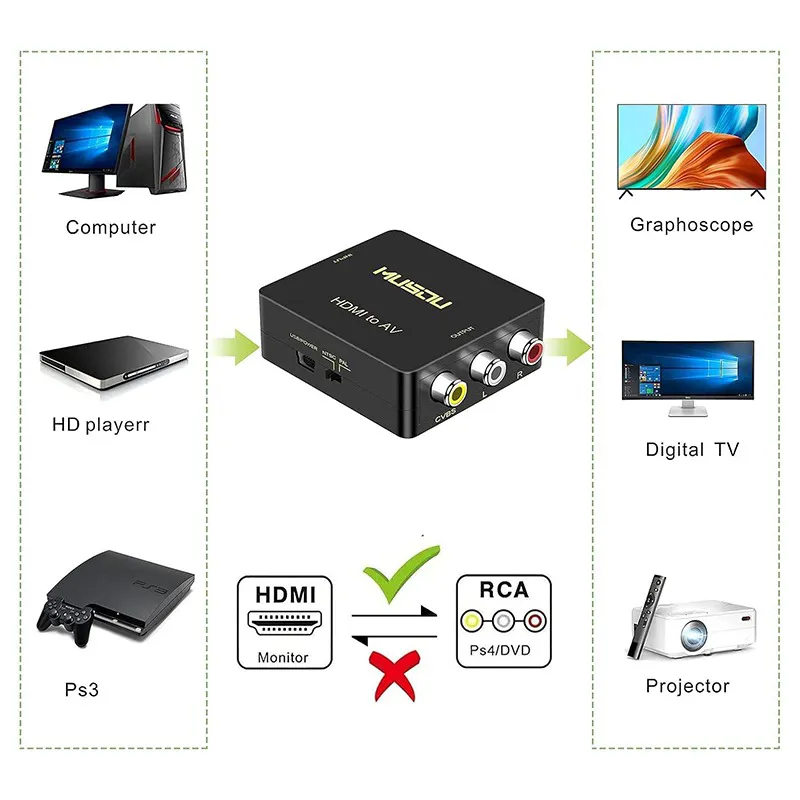 Plug & Play : بدون نیاز به نصب درایورها ، پردازش سیگنال قابل حمل ، منعطف ، پیشرفته با دقت ، رنگ ها ، وضوح بالا . سازگاری مناسب برای اتصال دستگاههای دارای خروجی HDMI مانند ضبطکننده های دیسک سخت، پخشکنندههای DVD، پخشکنندههای Blu-Ray، کنسولهای بازی ، گیرندههای تلویزیون یا رایانهها به دستگاههای قدیمیتر AV با ورودی ترکیبی مانند پروژکتور (پروژکتور)، گیرههای ویدیو ، تلویزیون لوله ، VHS، VCR ، پخشکننده DVD .
