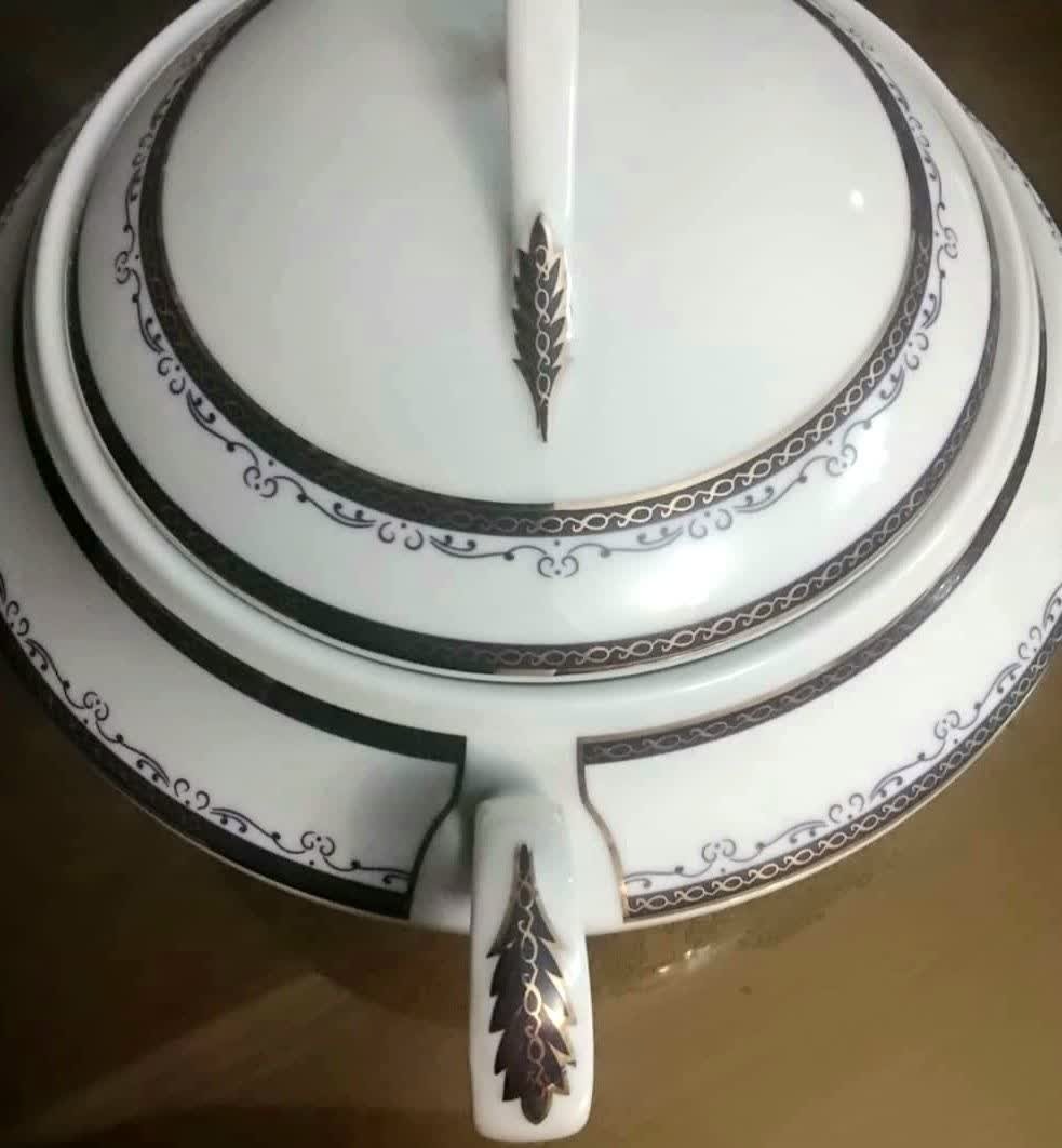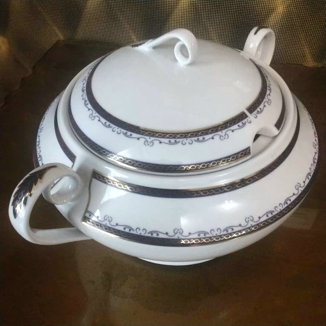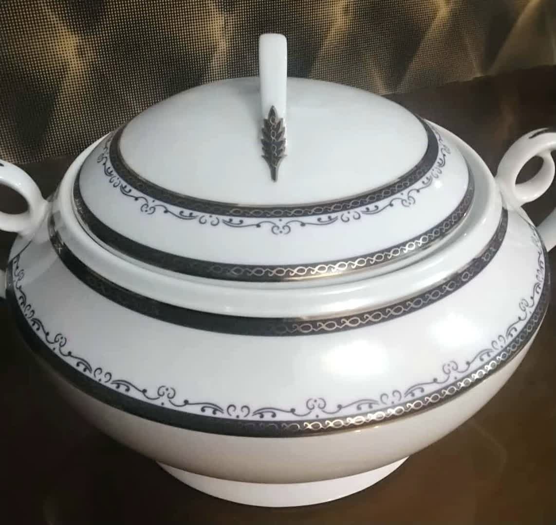 1عدد ظرف سوپینگ درب دار با جای ملاقه , دور لبه ها سرمه ای نقره کوب، طراحی شیک وفوق العاده زیبا با مارک مقصود وبا جعبه اورجینال.نو و آب نخورده.طول از دسته تا دسته 30 سانتیمتر و ارتفاع تا تاج 20 سانتیمتر..