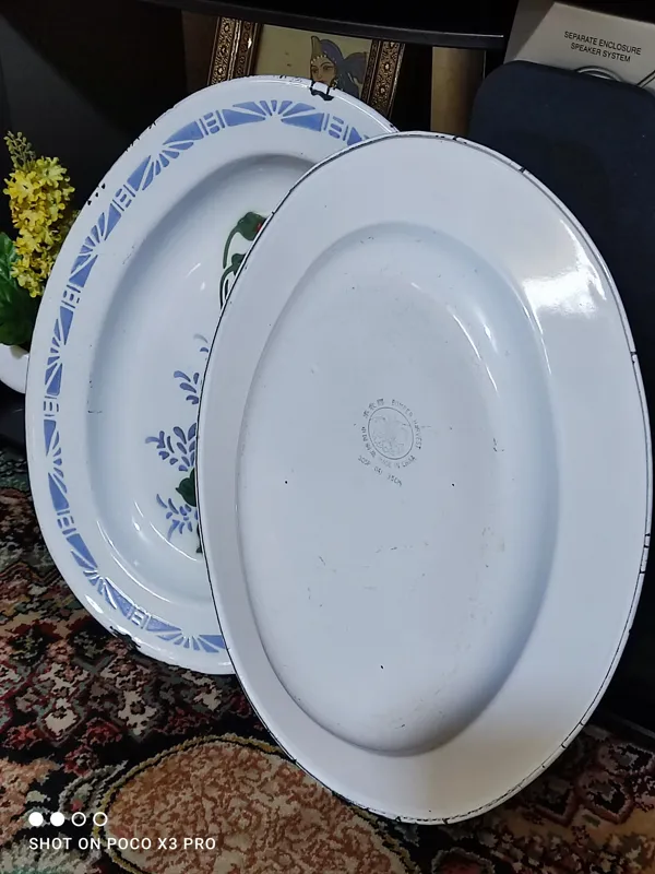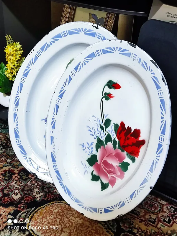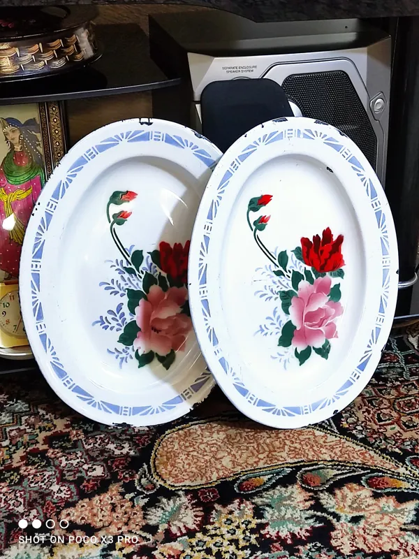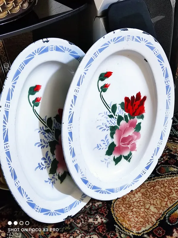 دو عدد سینی لعابی قدیمی بسیار تمیز و بکر مطابق تصاویر سایزش نسبتا بزرگه واقعا برای سیمی دست دوم خیلی تمیزه میشه گفت در حد نو