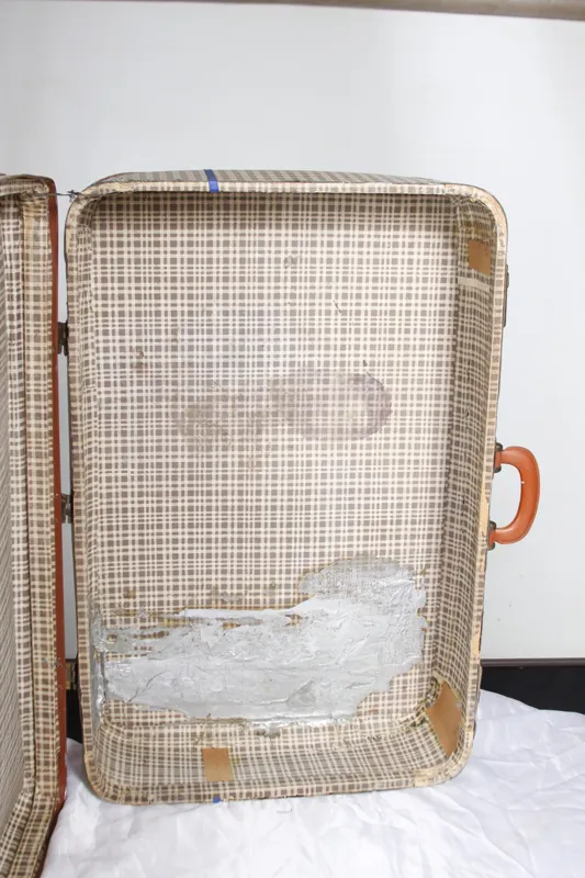 دو طرف چمدان روی قسمتهای ترمیم شده دو تا عکس چسبونده شده که اگر خواستید میتونید عکسهای مورد علاقه ی خودتون مثلا عزیزانتون رو روی کاغذ معمولی A4کپی پرینت بگیرید و بهمون اندازه که در عکس هست قیچی کنید و با چسب مایع یا چسب چوب بچسبونید