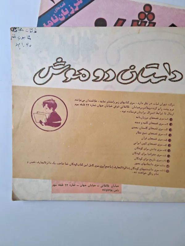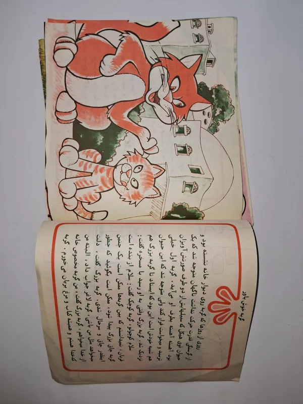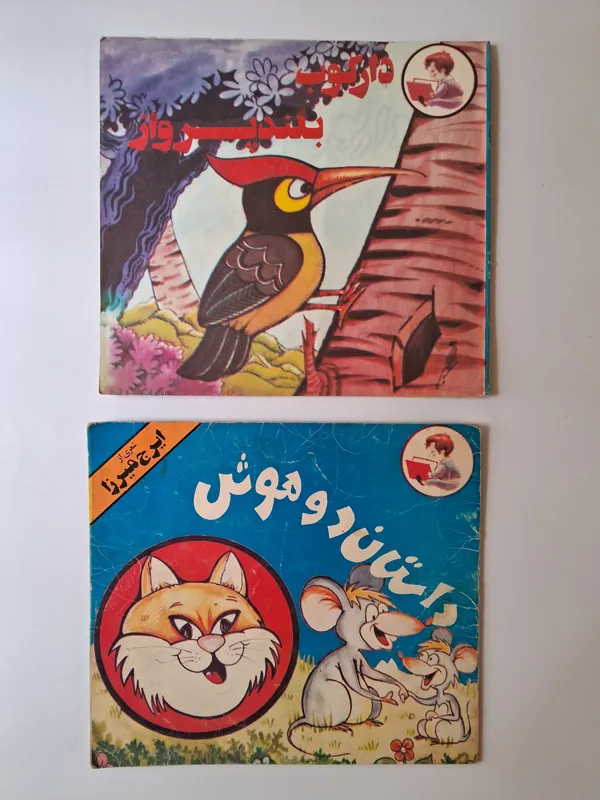 جلد کتاب داستان دو موش کهنه شده و شکستگی دارد، صفحات داخل کتاب کامل و بدون پارگی هستند، یک نوشته در ابتدای کتاب، و یک خط خوردگی با ماژیک در یکی از صفحات کتاب دیده میشود که در عکسهای سوم و چهارم قابل مشاهده می باشند.