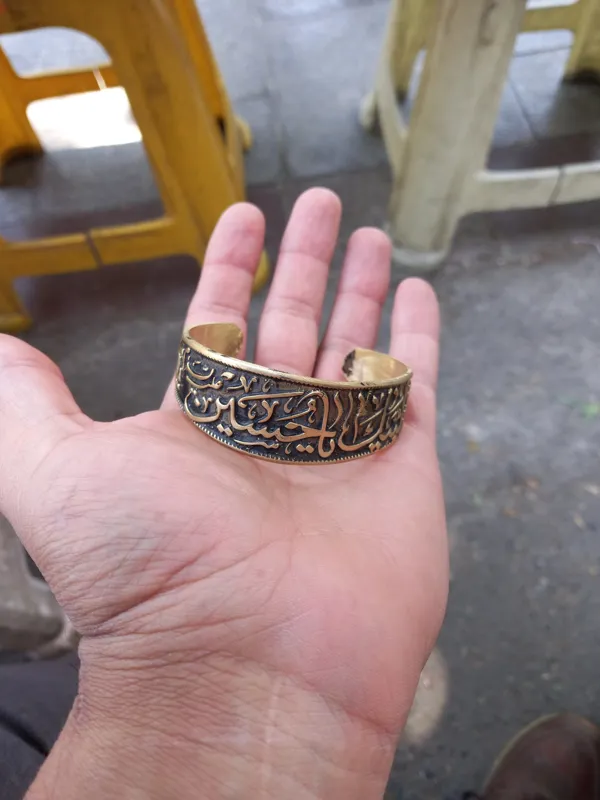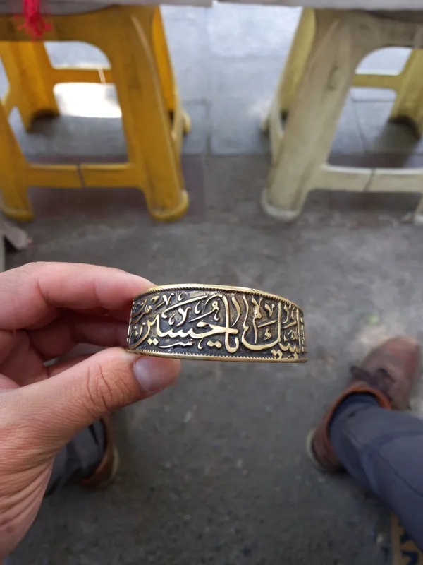 دستبند تمام برنجی باطراحی بینظیر نقش برجسته لبیک یا حسین فیری سایز قابل بازوجمع شدن سیاه قلمکاری شده هدیه وکادوی ماندگار