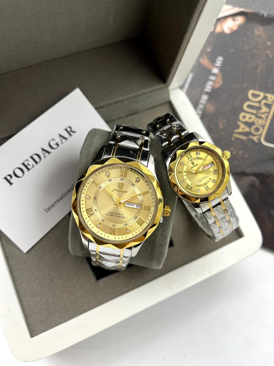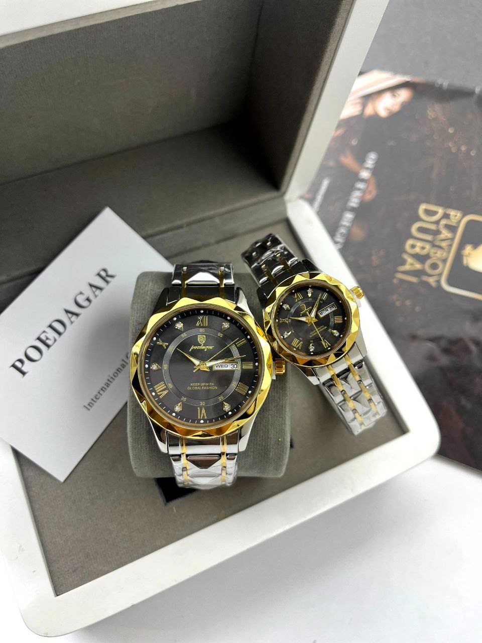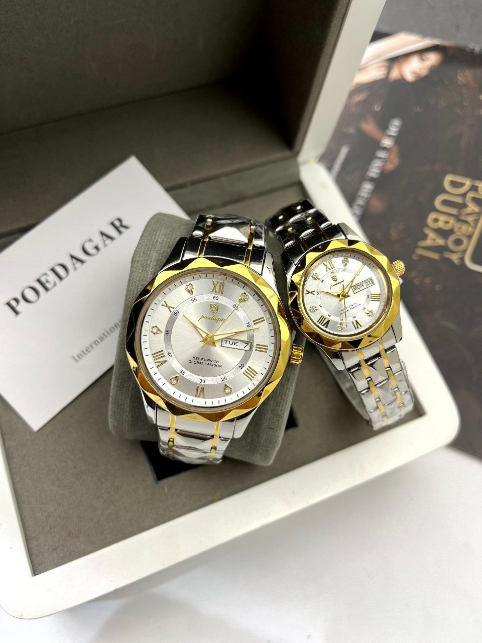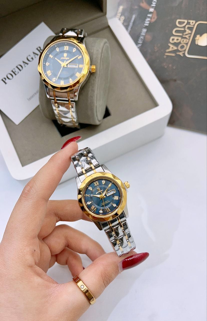 ست ساعت مچی دوتقویم بند استیل رنگ ثابت پوداگار