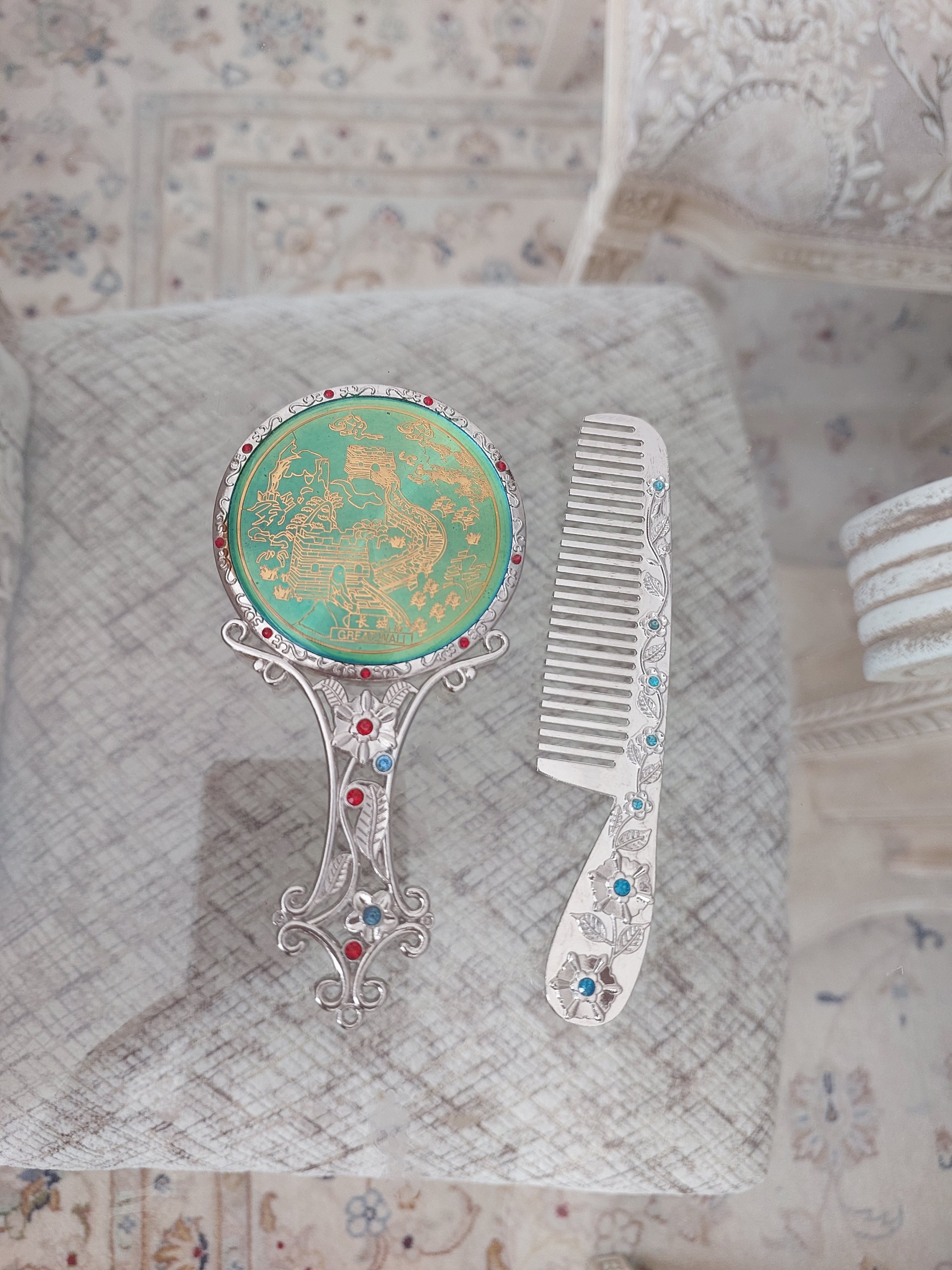 ست شانه و آینه با تصویر بسیار زیبا از دیوارچین در پشت آینه ، همراه با جعبه