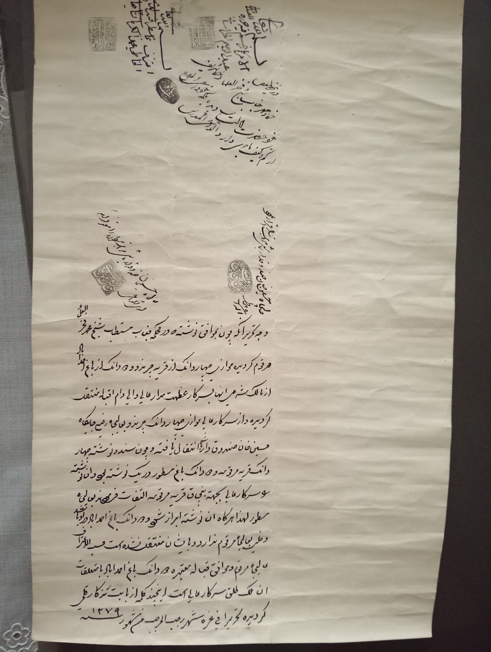 سند خطی معامله بخشی از قریه چرندود مابین والی قریه و حسین خان صندوق دار با مهر و امضا فخر العلما و شاهدان