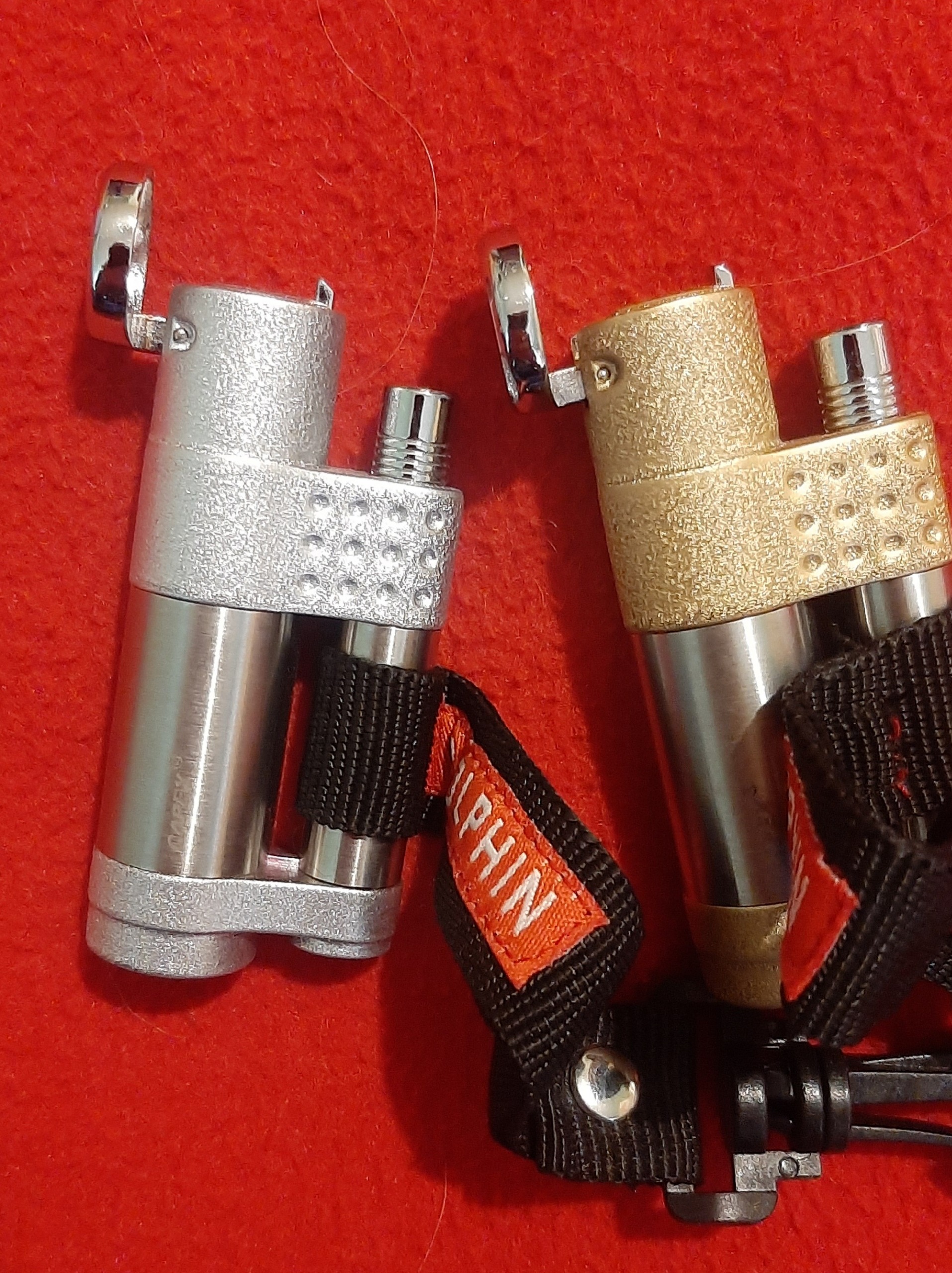 نقره ای و طلایی ، با بند و گیره قابل نصب روی کمربند ( روی بند کلمه DOLPHIN درج شده )