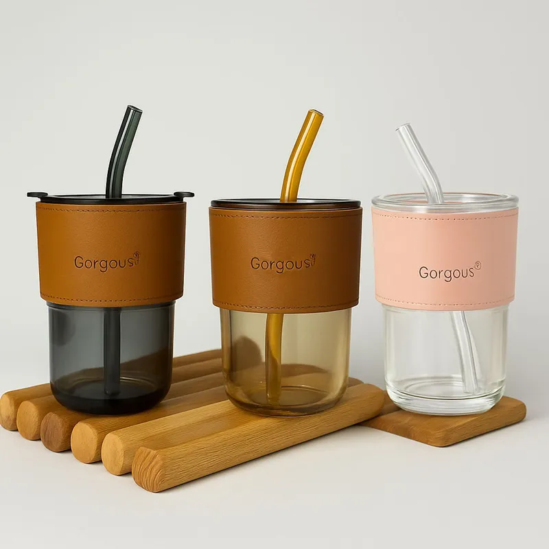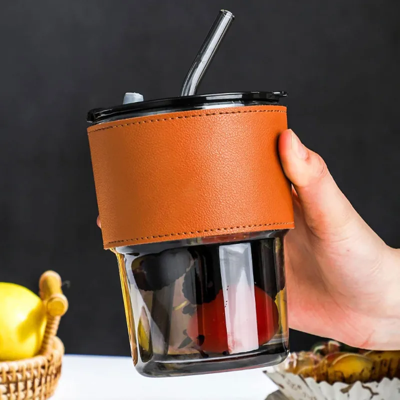 لیوان gorgous مدل شیشه ای دور چرم یک لیوان بسیار شیک و کاربردی است. این لیوان دارای یک نی شیشه ای و همچنین یک آسان نوش برای نوشیدنی های سرد و گرم است. همچنین چرم دور لیوان آن را خوش دست تر و زیبا تر می کند.