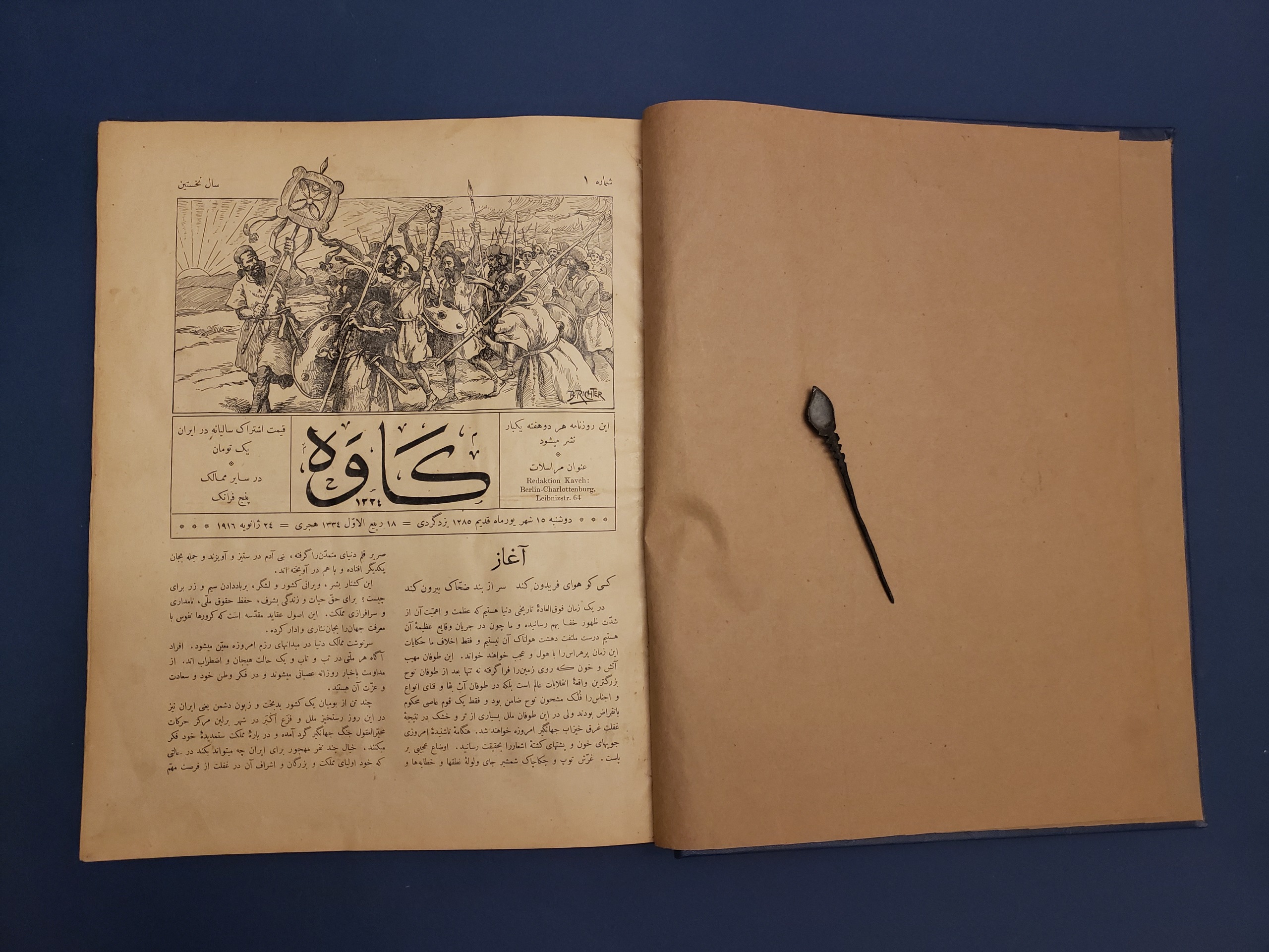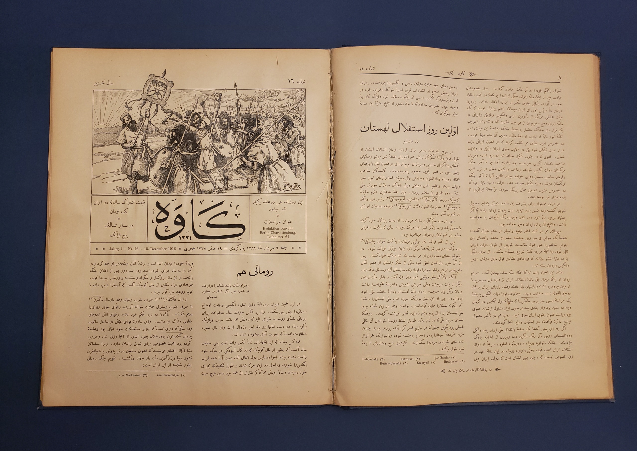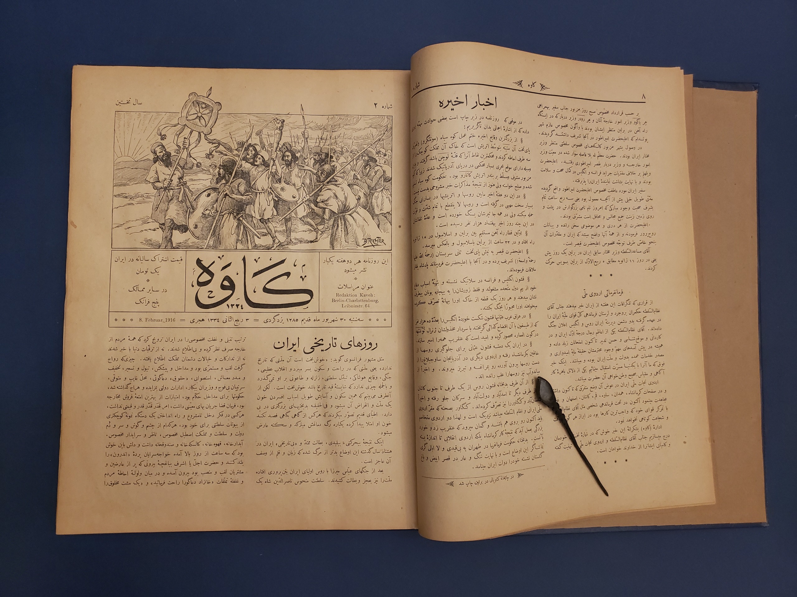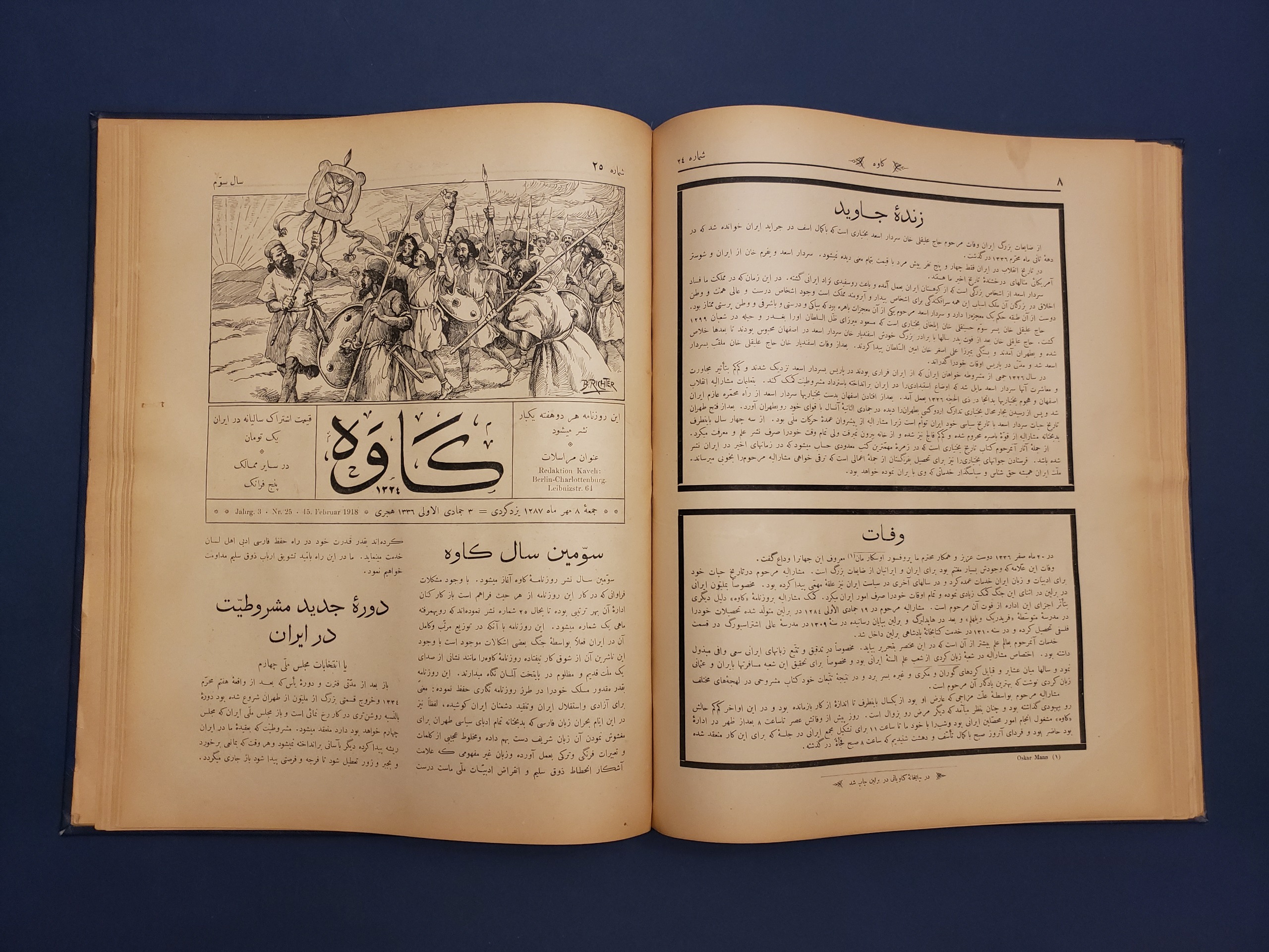 دوره اول نشریه کاوه شامل 32 عدد چاپ برلین، صحافی شده در یک مجلد،سال اول و دوم و سوم که 3 عدد کسری دارد شامل شماره های 15، 29 و 30