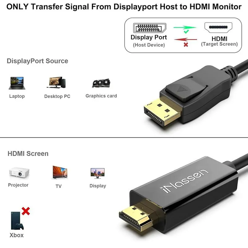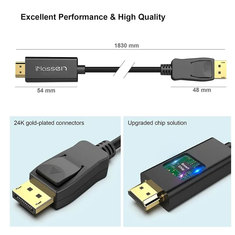 انتقال عالی : کابل iNassen DisplayPort به HDMI دارای طول کابل 6 فوت یعنی 1.8متر میباشد . از وضوح 4K پشتیبانی می کند از بهترین تراشه و صفحه نمایش چندگانه حرفه ای برای پخش و دقیق داده استفاده می کند . پایداری برتر - تراشه آی سی پیشرفته داخلی سیگنال DisplayPort را به سیگنال HDMI تبدیل می کند . دقت شود این یک مبدل دو جهته نیست و نمی تواند سیگنال ها را از HDMI به DisplayPort منتقل کند . سر دیسپلی پورت رو باید به کارت گرافیک زد و خروجی تصویر با پورت hdmi را به هر نمایشکری میتوان وصل کرد . مجهز به روکش و لایه های آبکاری شده طلا برای انتقال بهتر و پایدارتر تصویر . یا حق