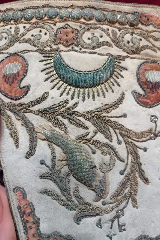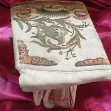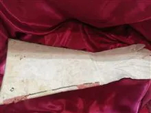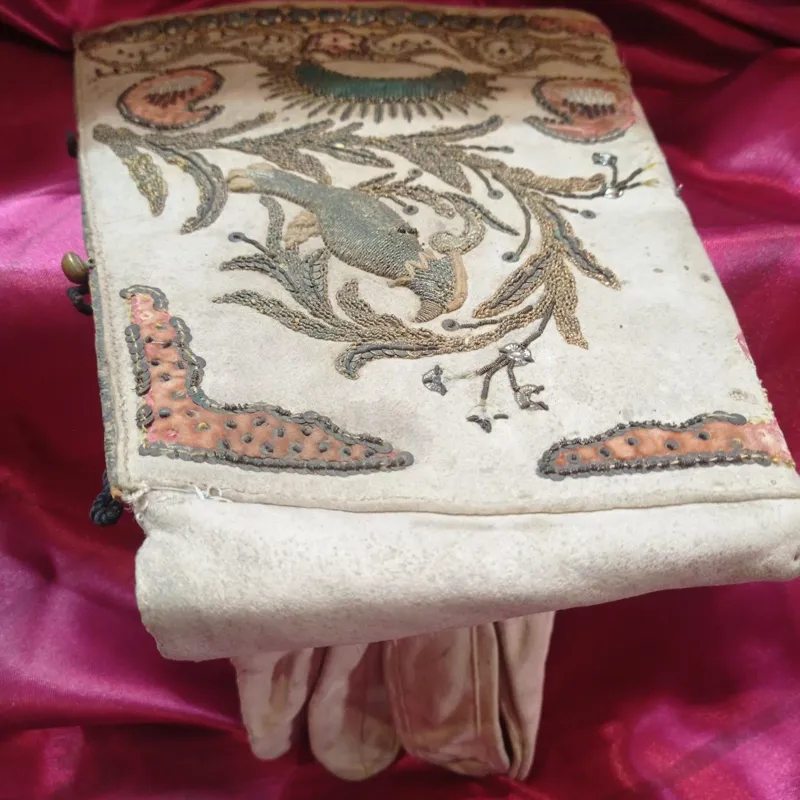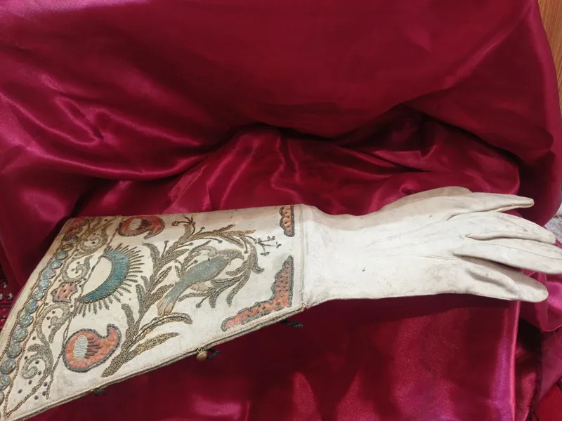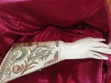 دستکش بسیار قدیمی و فقط یک لنگ موجود است ، کار برجسته روی ساق دستکش بی نظیره ، نایاب و تک به حساب میاد ، کمی کثیف شده و از چهار دکمه فلزی کنار دستکش یک عدد باقی مانده ، اما هیچ ایراد دیگه ای ندارد .