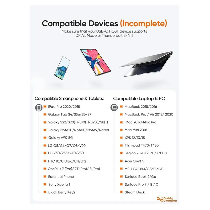 داراس رزولوشن : 4K 30Hz  با کابل CableCreation USB C به HDMI که تا رزولوشن 4K 30Hz را پشتیبانی می کند ، از کیفیت ویدیویی خیره کننده لذت ببرید . سازگاری گسترده : کابل USB نوع C به HDMI مستلزم آن است که دستگاه USB-C شما باید از حالت DP Alt یا Thunderbolt 3/4 پشتیبانی کند . لطفا به عکس سوم و مدل های نوشته شده زیر دقت کنید : با MacBook Pro/MacBook Air 2020/2019/2018، iMac 2017/iMac Pro، Mac Mini، iPad Pro M1 2021/2020/2018، XPS 15/13/12، Google Chromebook Pixel (2015)/Pixel Pro , و Surface Pro ، کار می کند . 7/Pro 8، Surface Book 2/Surface Go، LG G5/Q8/V20، Galaxy Tab S4/S5e/S6/S7 و تلفن گلکسی از حالت DEX پشتیبانی می کنند (S22/S22 Ultra/S20/S10/S9/S8/Note20 /Note10/Note9/Note8). انتقال سیگنال پایدار : این کابل با کانکتورهای روکش طلا و محافظ سه لایه ، انتقال سیگنال پایدار را فراهم می کند و از دست دادن سیگنال را کاهش می دهد . استفاده آسان : به سادگی وصل و پخش کنید ، بدون نیاز به نصب درایور یا نرم افزار . یا حق