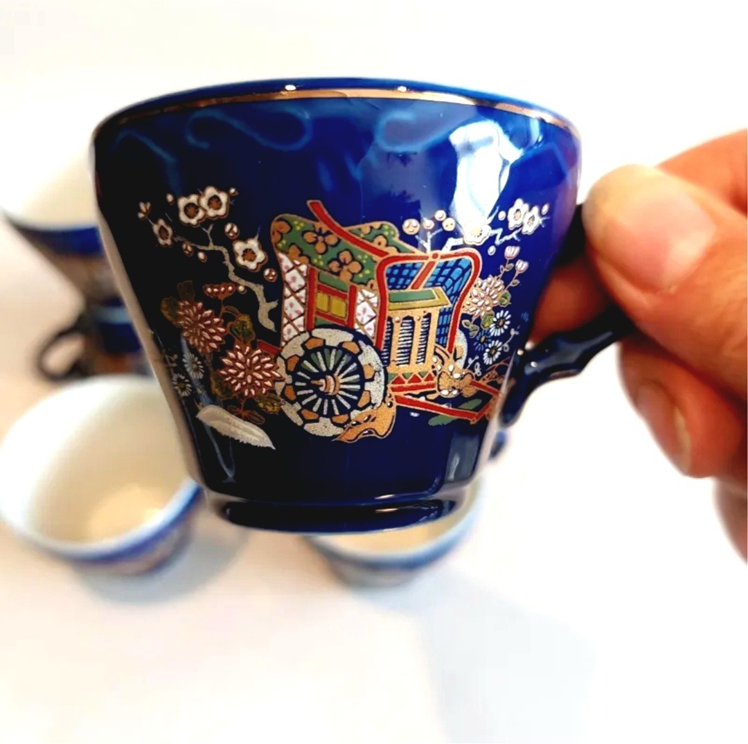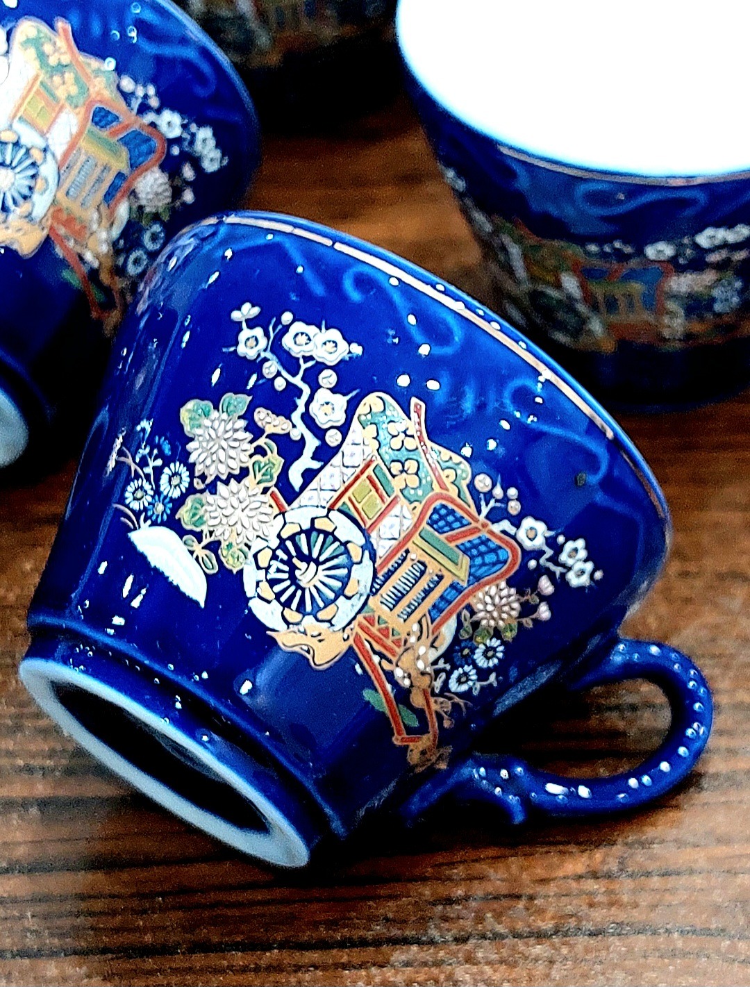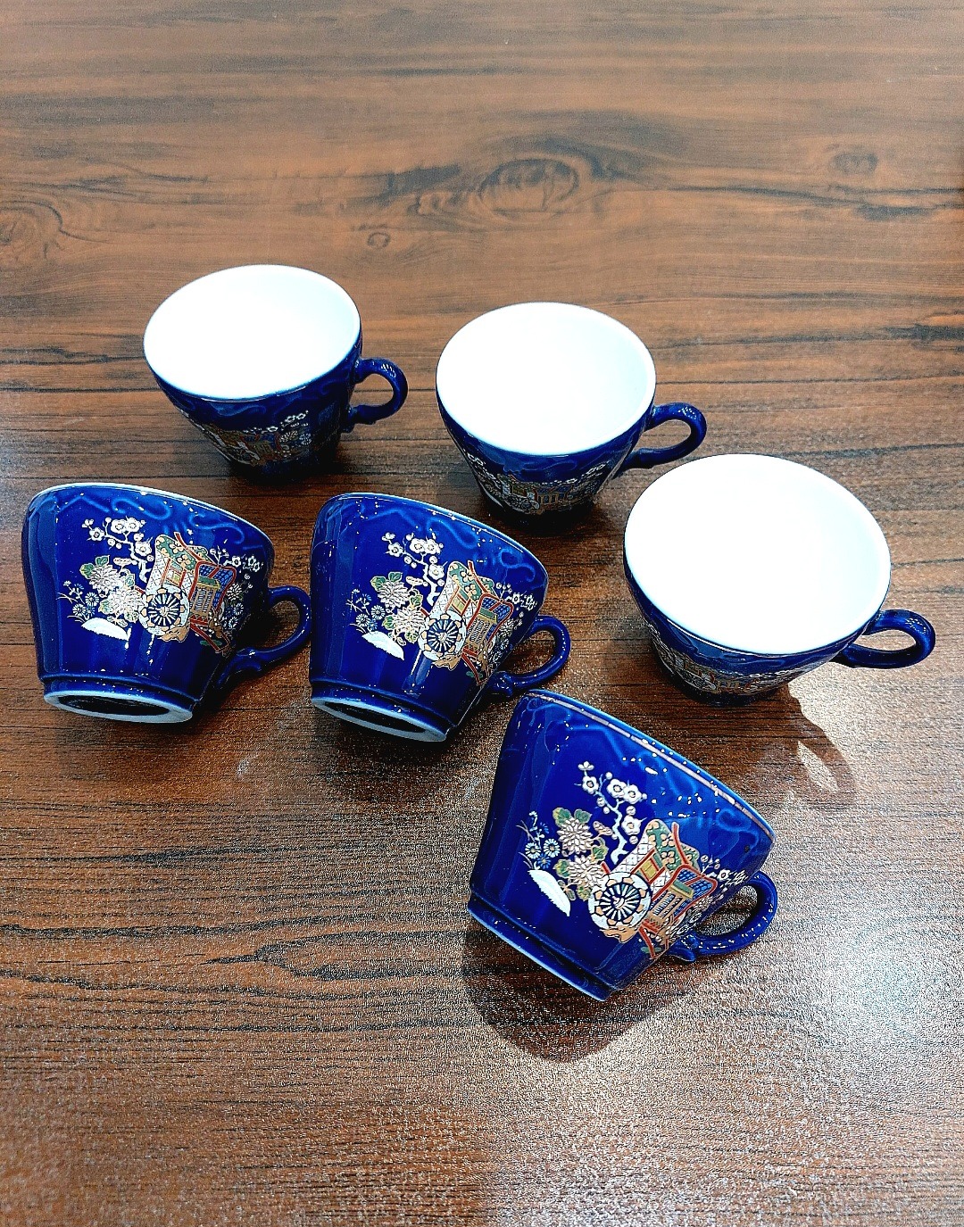یک دست فنجان قهوه خوری بسیار زیبای ژاپن با طرح کالسکه و طلا کوب . بدون نعلبکی