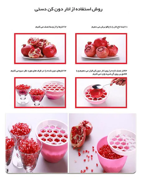 انار دون کن پارسینا وسیله ای خلاقانه و کاربردی می باشد که به وسیله آن می توان بدون تماس دست و همچنین عدم له شدن ، دانه های انار را از میوه آن جدا نمود